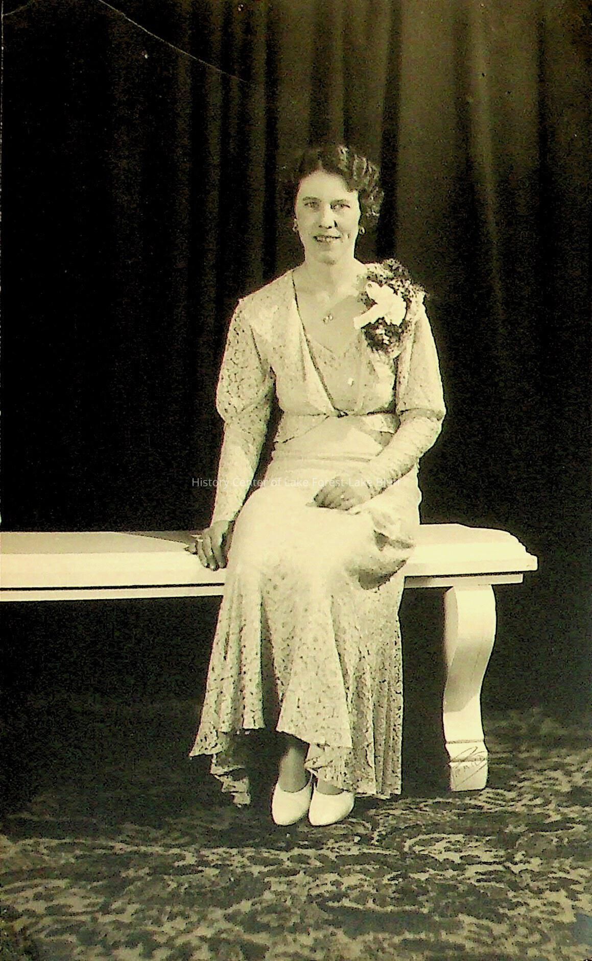 Photograph of an unidentified woman, seated on a stone bench. Back reads, "Lovingly, Blanche. May 21, 1935"