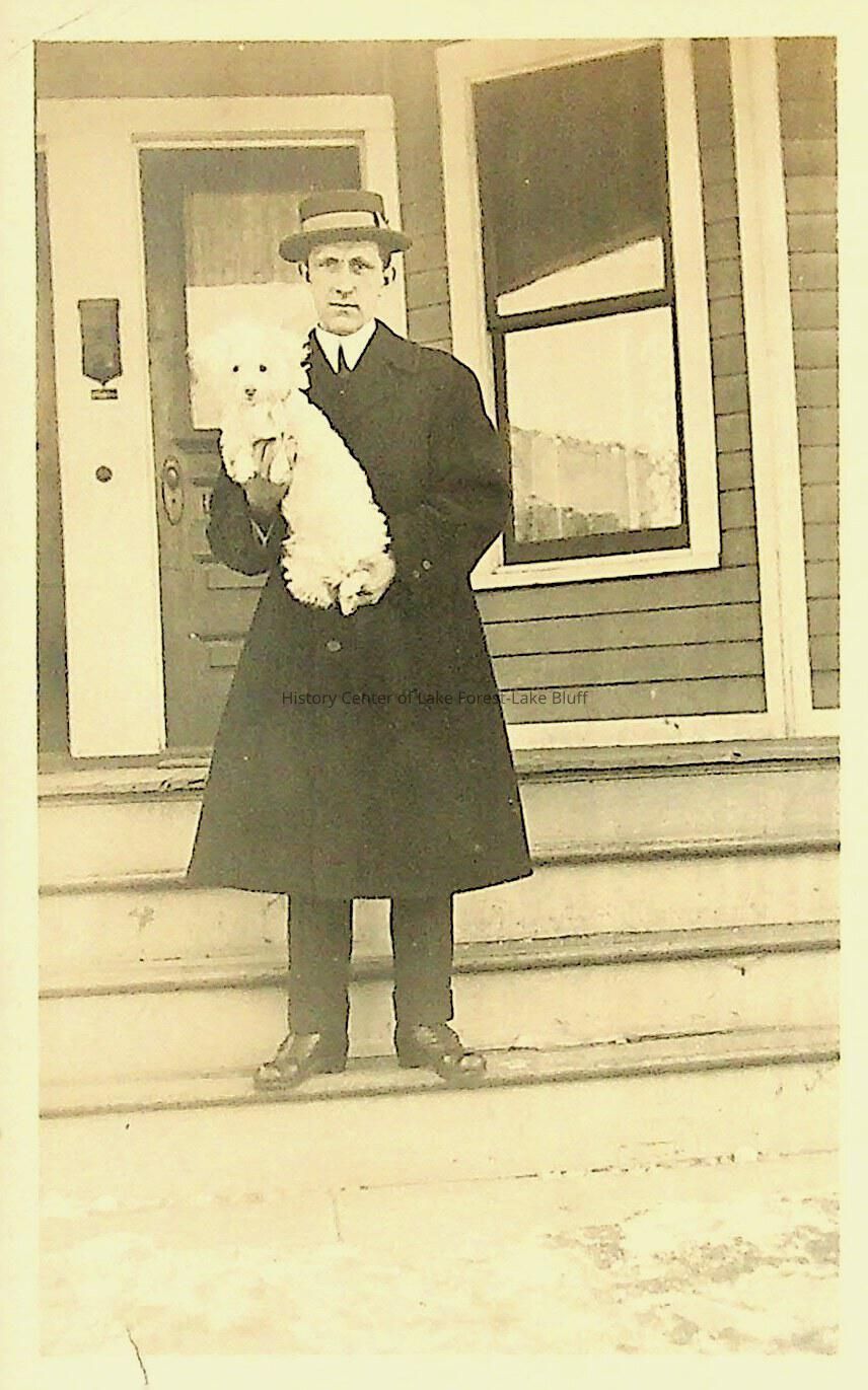Photograph postcard of James "Jim" Dinley, husband of Jean Dow Dinley holding the family dog outside of their home. Back of postcard reads "Jim Dinley". Undated.