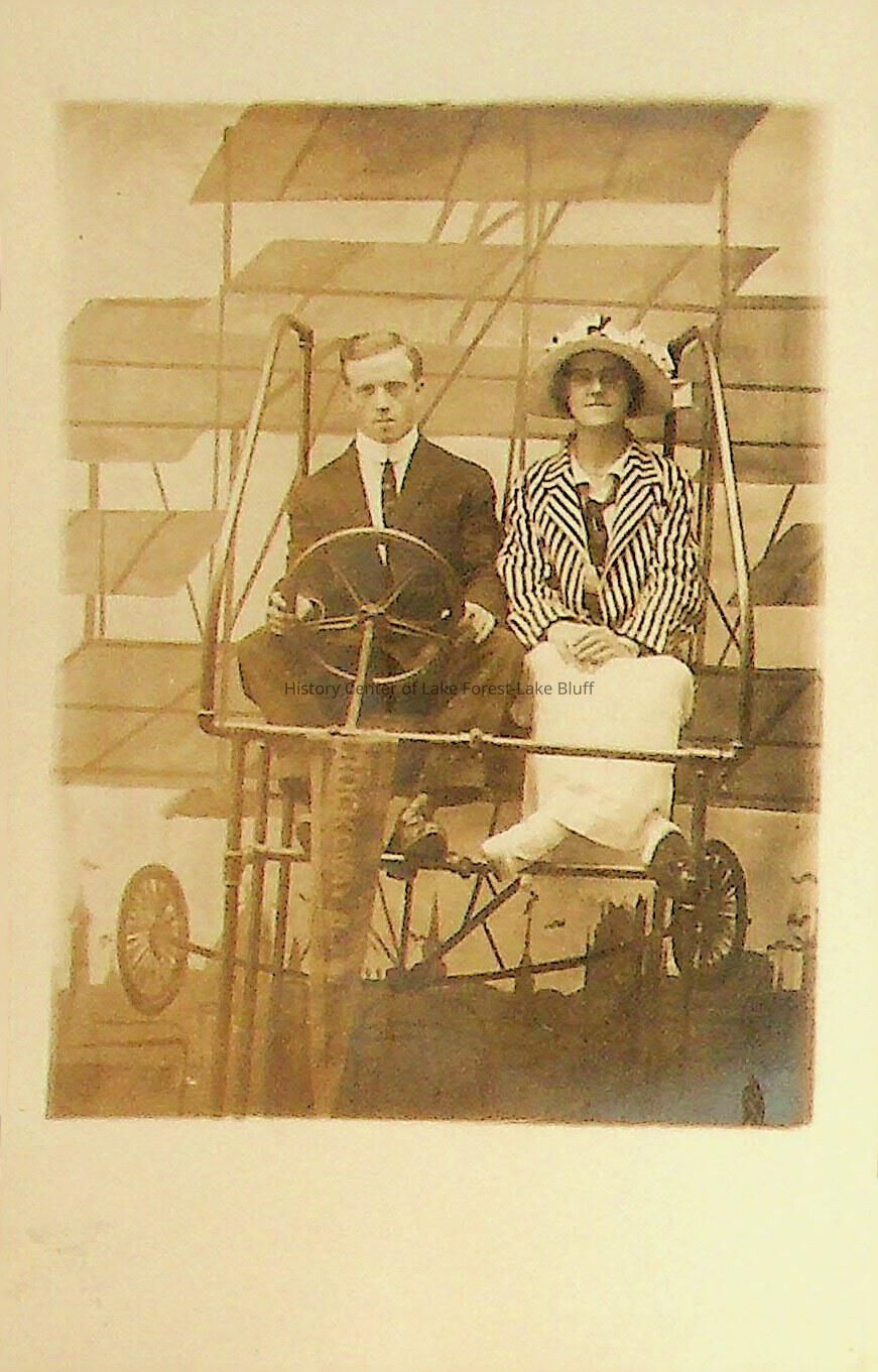 Postcard photograph of a couple on a faux-airplane, possibly Jean and James Dinley. Undated.