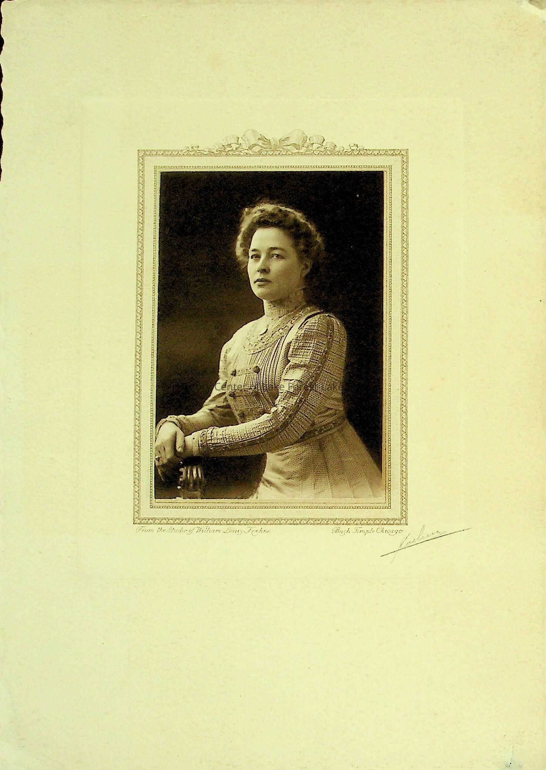 Photograph of an unidentified woman. Portrait taken from the studio of William Louis Koehne. Undated but clothing and silhouette suggests it was taken circa 1900.