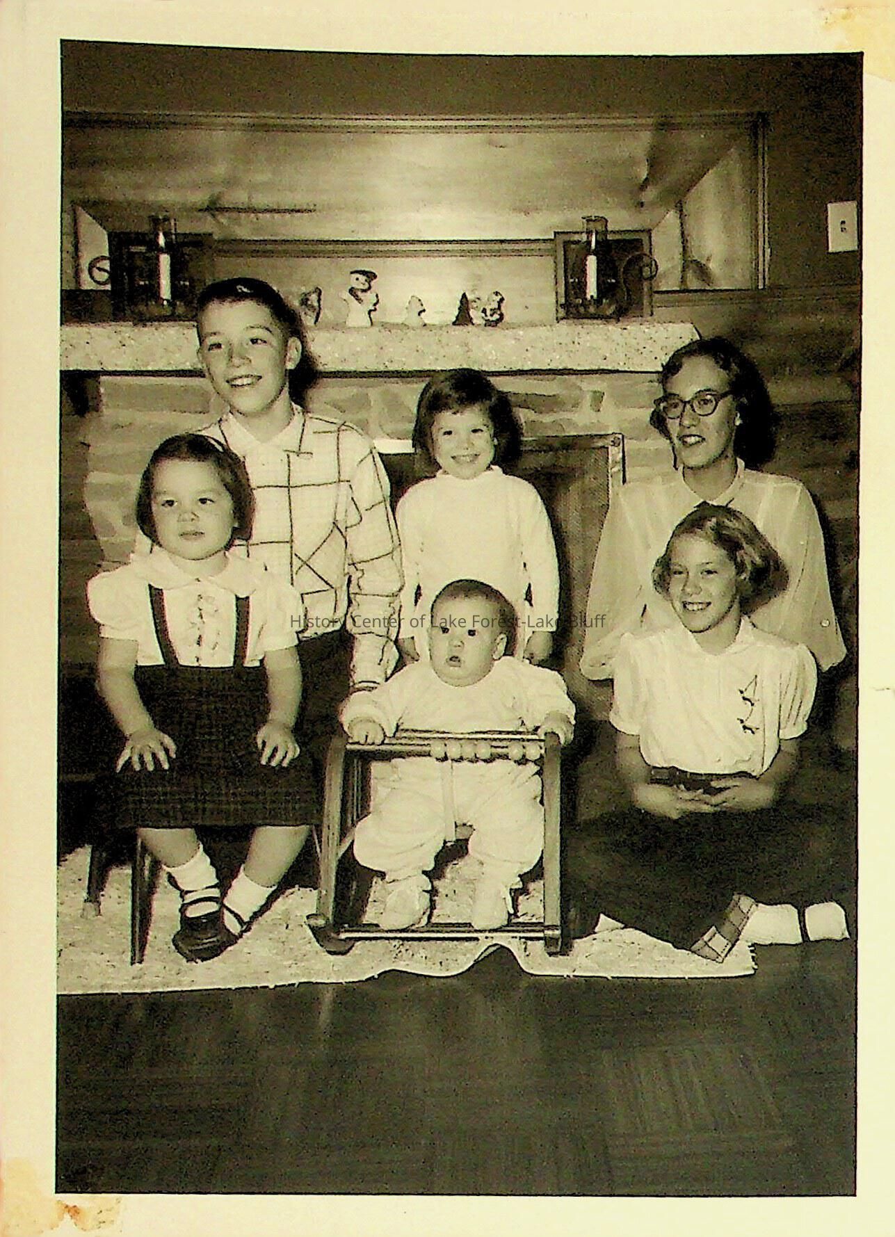 Photograph of a family in their home. The back of the photo features a stamp which reads " Photo by Scotty's Photo Studio, 197 East Westminster, Lake Forest, Illinois, Phone 3055" Undated.