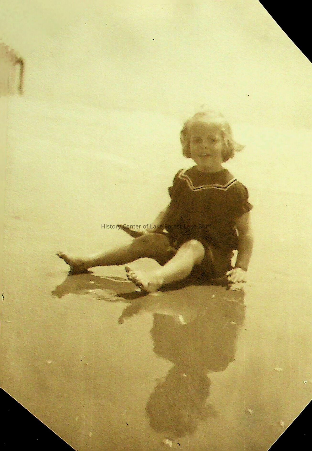 Photograph of an unidentified child playing in the sand. The photo has been cut out of a scrapbook, as its corners have been trimmed.