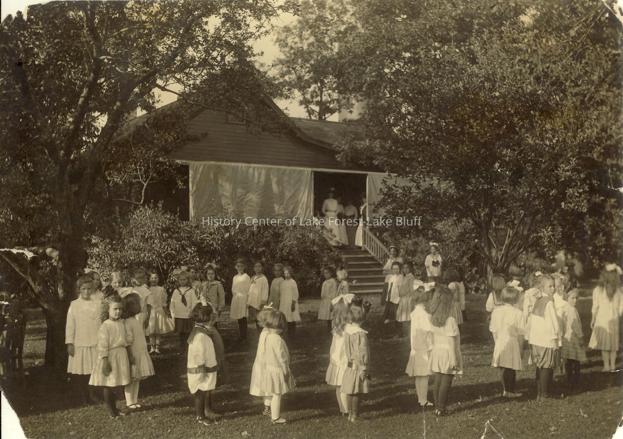 Girls participating in Junior gymnastics at the YWCA at the Aldis Playhouse. Thirty girls standing in pairs on front lawn. All wearing white tops and skirts. Building structure in background of image. Trees at left and right, in leaf.