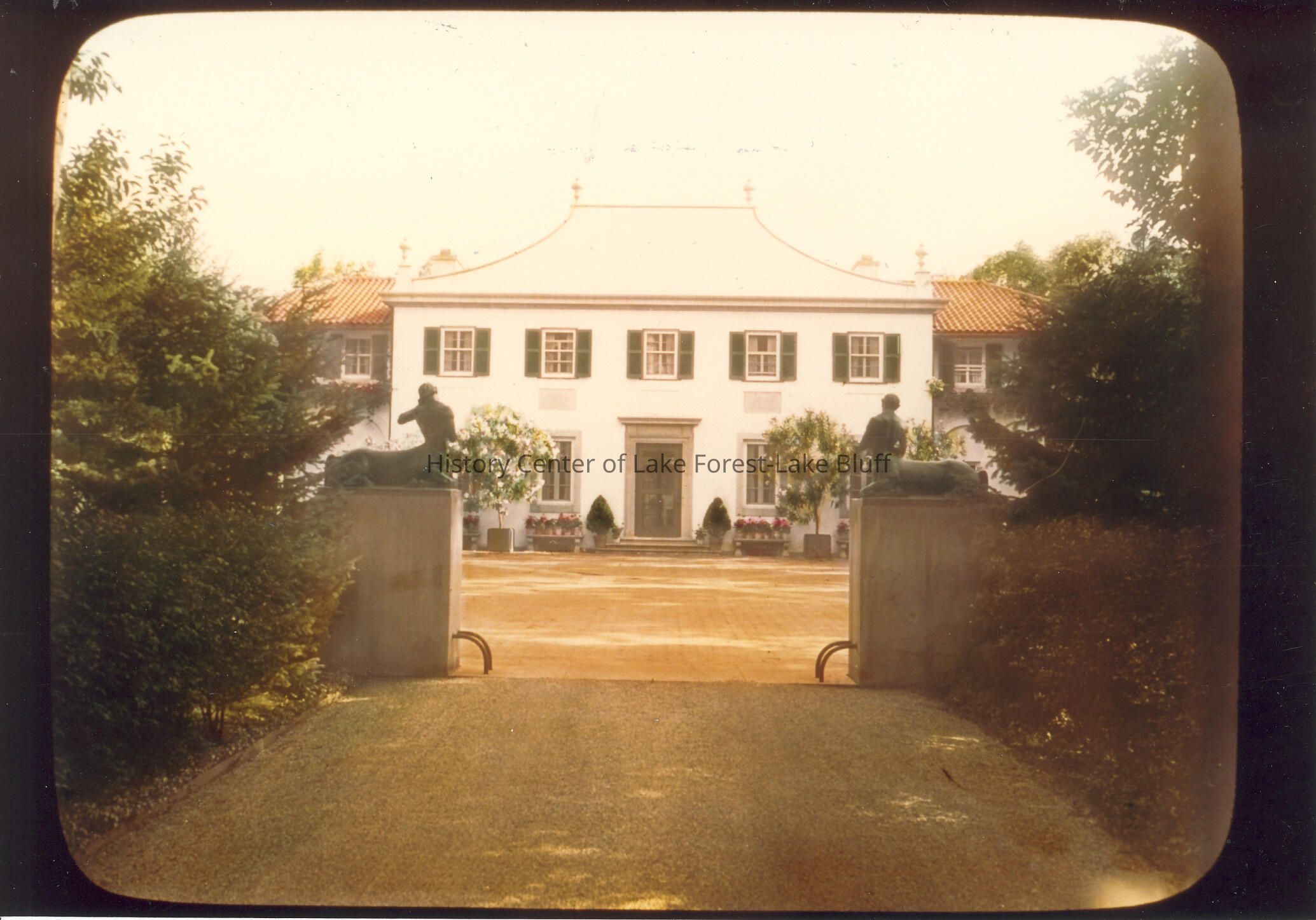 Entrance to white two-story residence with clay tile roofing on sides and two centaur statues on top of stone walls