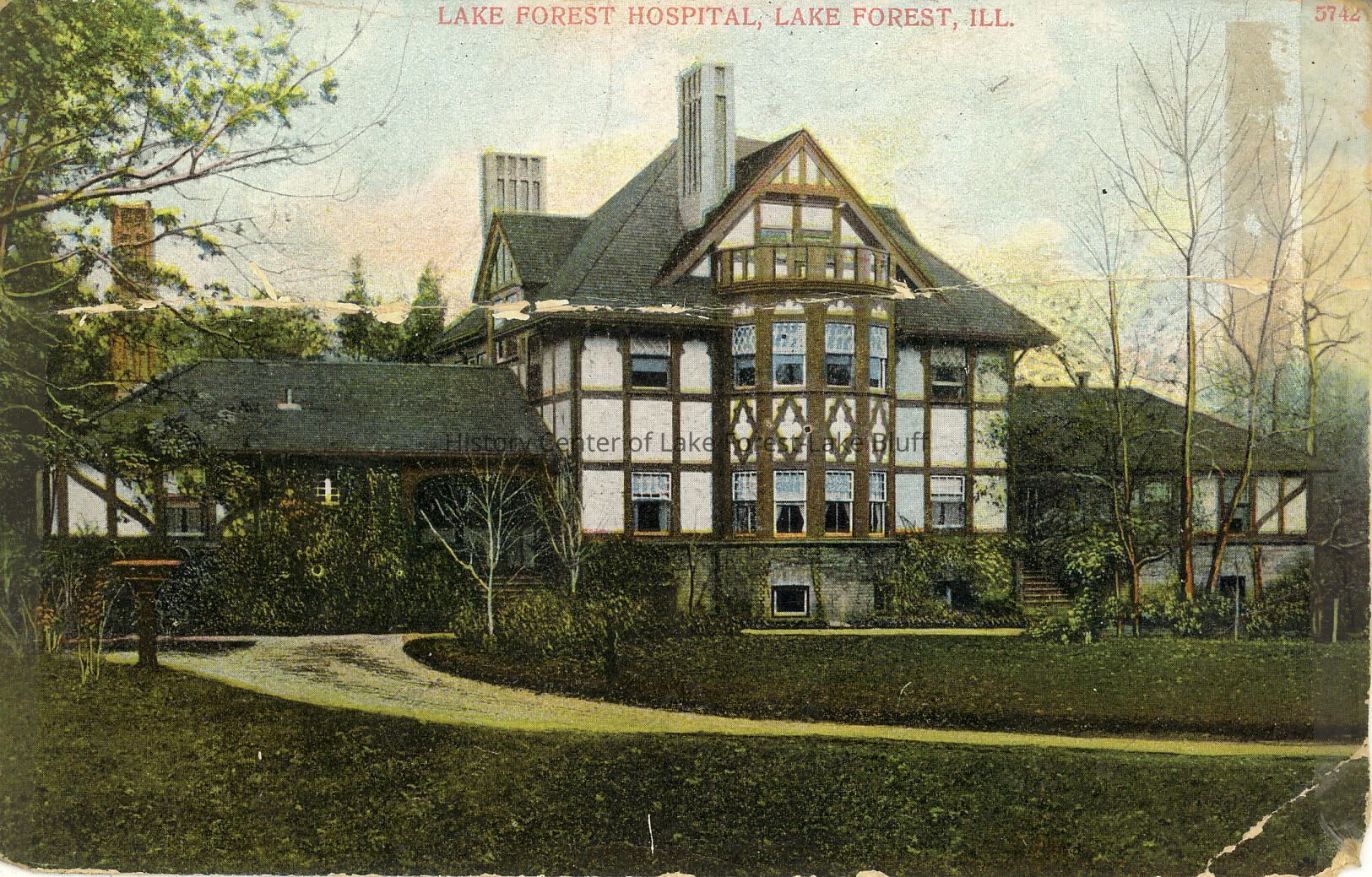Postcard with full color image of Alice Home Hospital. Front is labeled "Lake Forest Hospital, Lake Forest, ILL." Back is dated 8/8/1907. Postcard is addressed to Mrs. Geo. W. Fawcett, ?, Ind. from Jem. It reads, "Dear Mother, Reced your letter few days ago - am well, will write you soon, am here [Alice Home Hospital] today having some dental work done."Lexicon