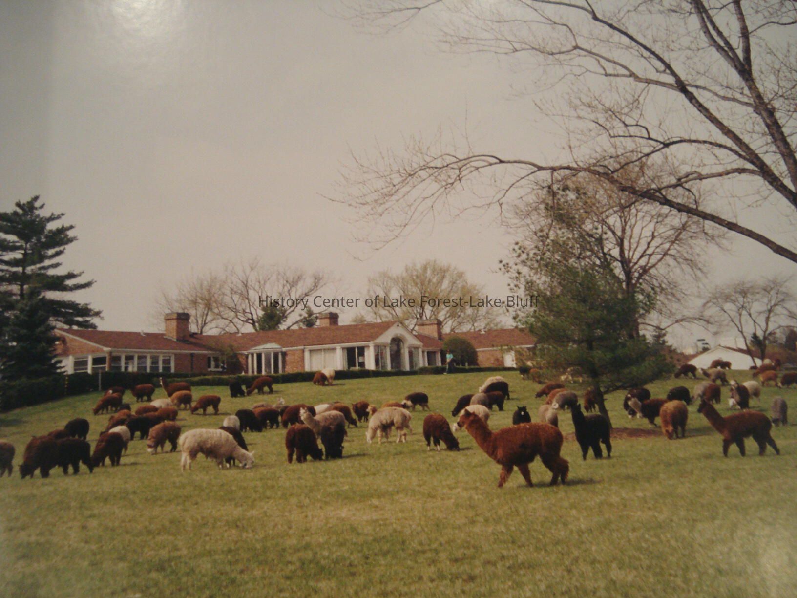 Color image. Front lawn of red brick house full of alpacas and llams. Marshall Field IV home near Lake Forest Academy.