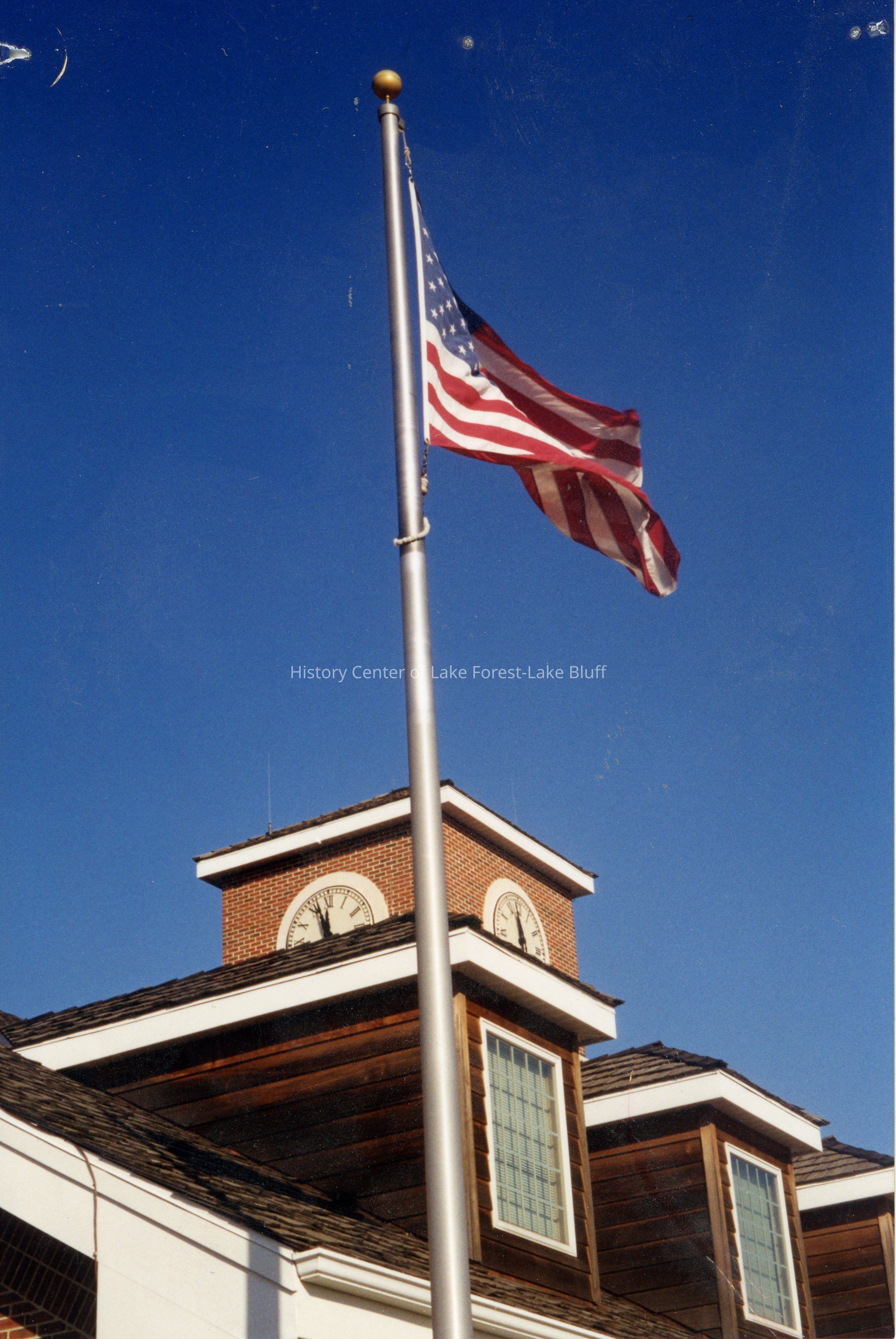 An American flag waves atop a flagpole before a classic brick building with a clock tower.