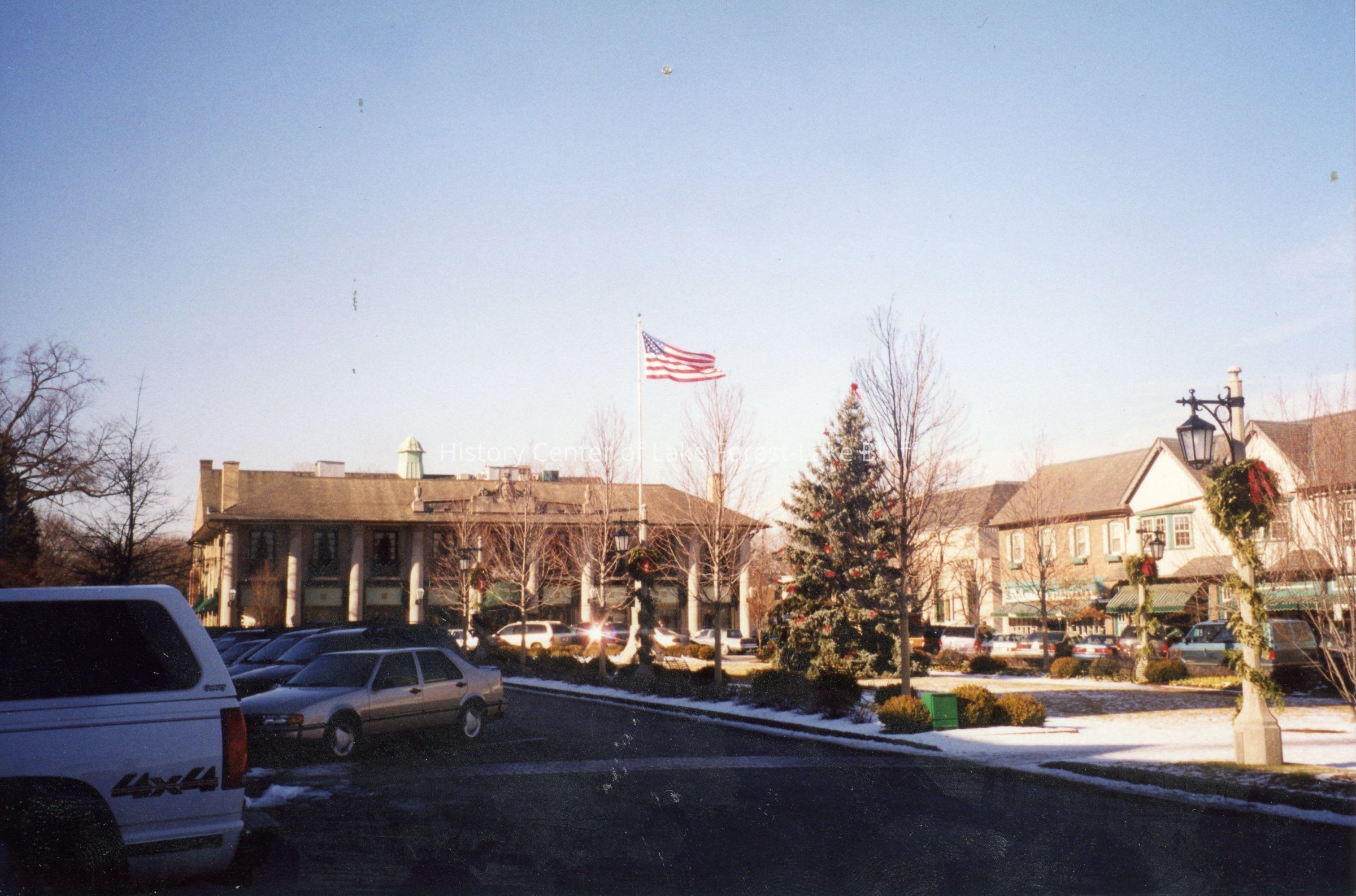 The image depicts a parking area with cars, a building adorned with festive decorations, and an American flag.