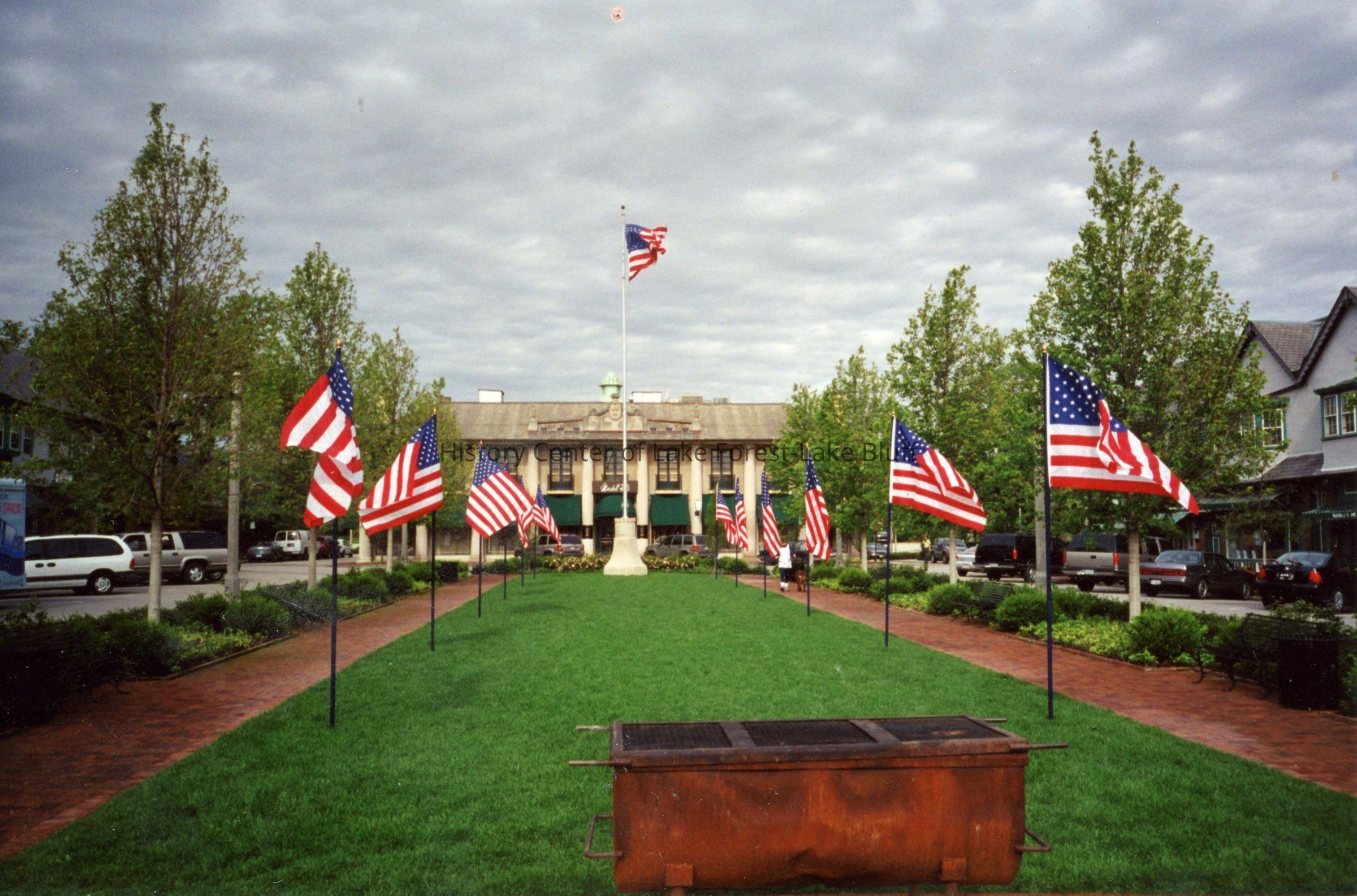 Photograph of American flags along a stretch of grass, Memorial Day, 2001.
