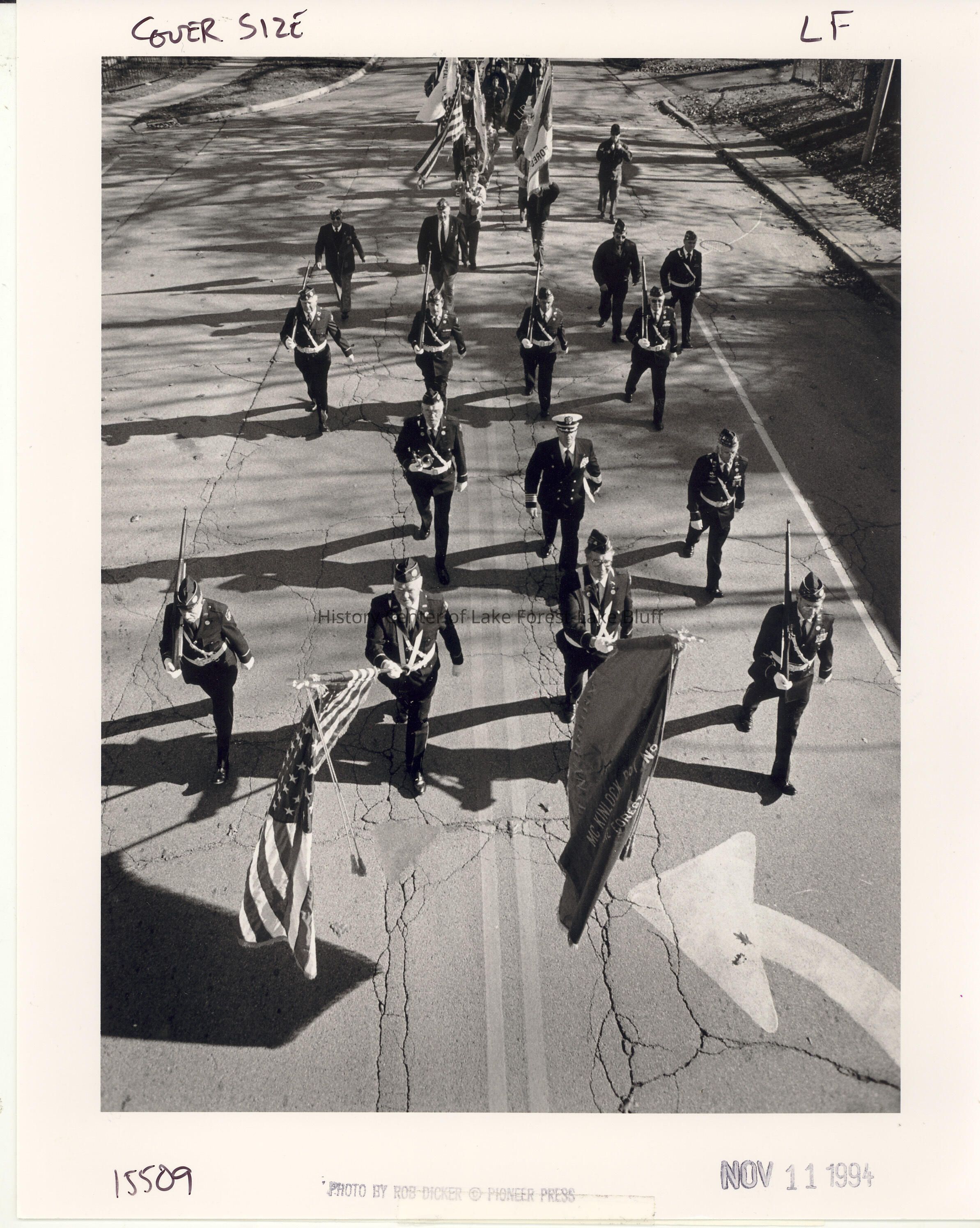 "American Legion members lead the parade from Gorton Community Center to Market Square for the Veteran's Day commemoration ceremony."