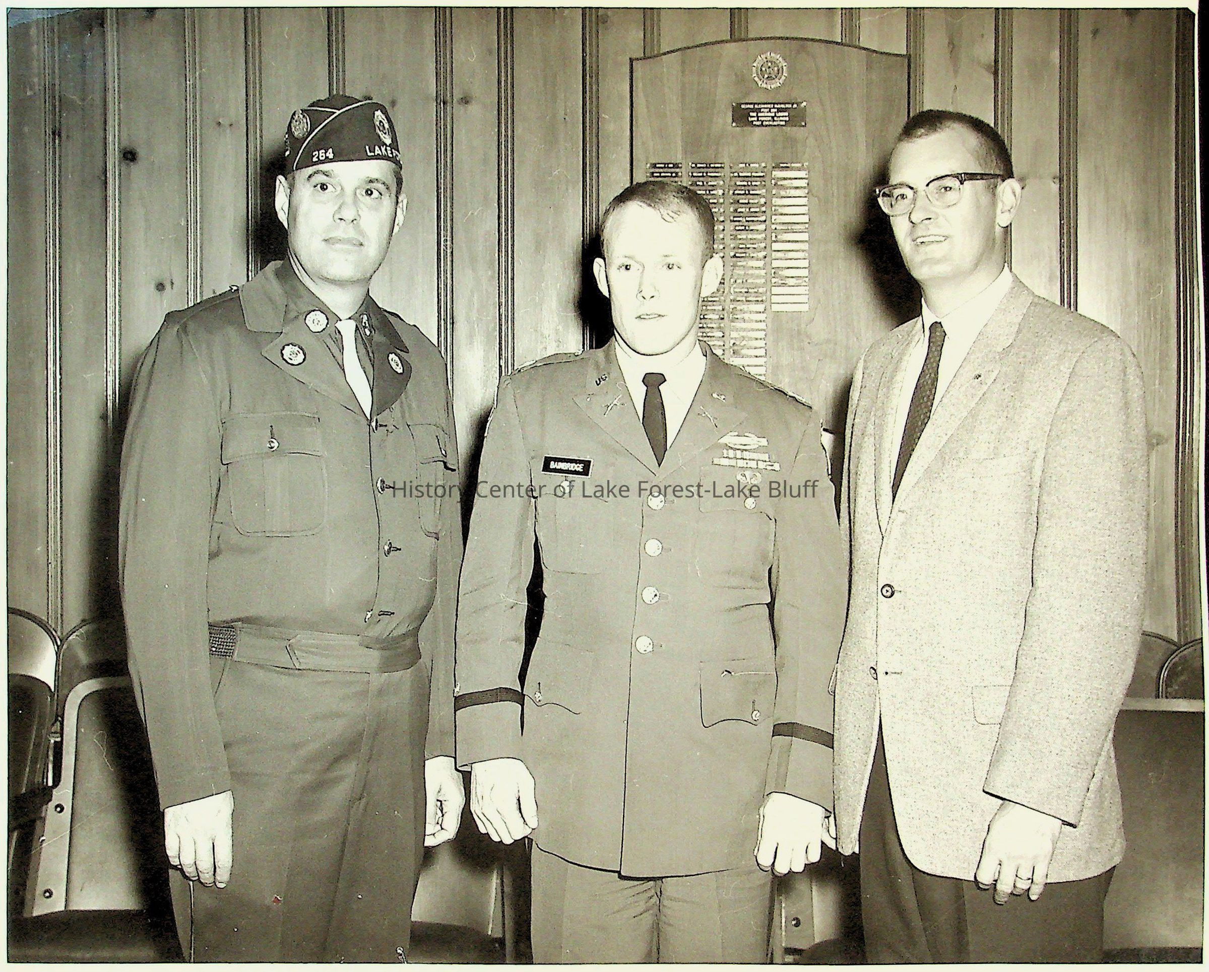 Three men, two in military uniforms and one in a suit, stand together in a room with wooden-paneled walls.