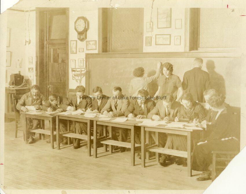 Americanization or American Naturalization Class at Gorton School or City Hall. Ten adults at desks writing and one adult lady looking over their shoulders as a lady and man are writing at the chalkboard.