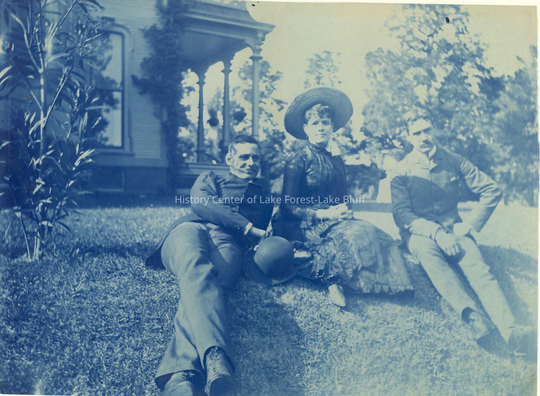 Farwell Family - mostly 1880's picture of three people w/ Anna Farwell in the middle, with two unidentified young men, (probably Reginald DeKoven at right) and portion of house in background, printed on blue processing paper