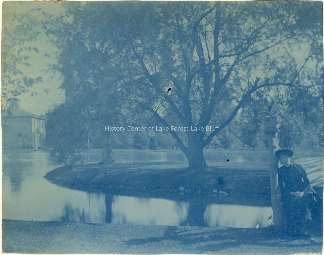 Farwell Pond with a woman nearby, probably Anna Farwell - invitation to Anna Farwell's wedding on back of photograph, printed on blue processing paper.