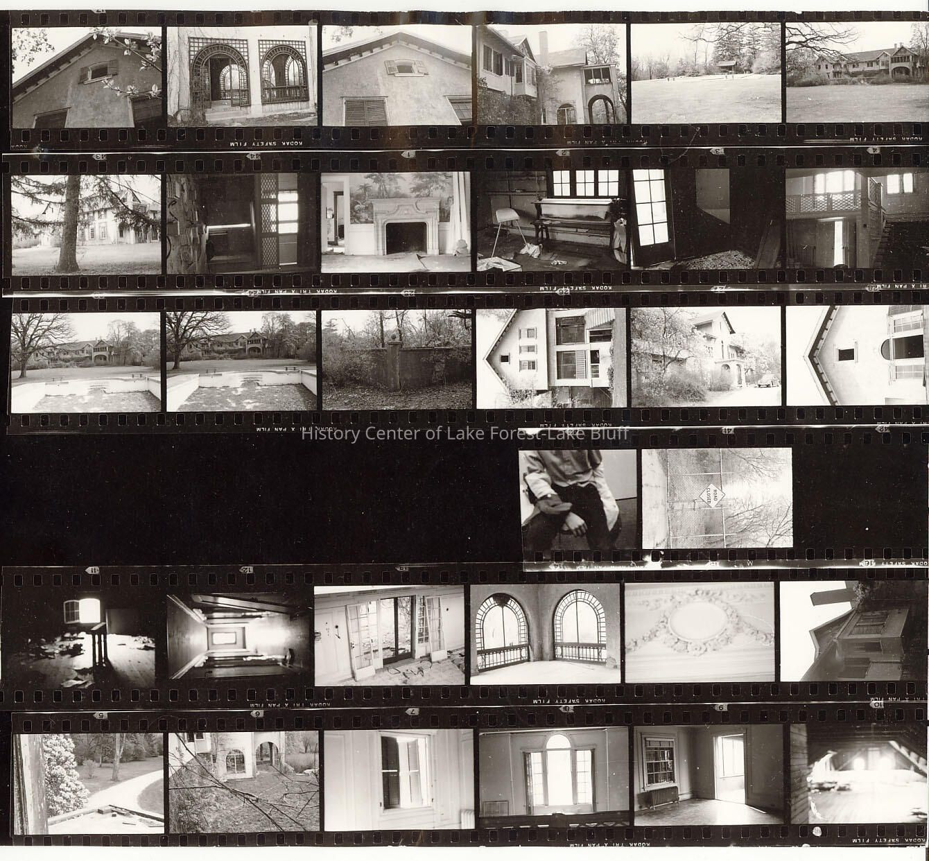 black and white contact sheet of exterior and interior images from Arcady Farm (80 N. Waukegan Rd) prior to demolition. May 1975 Arthur Heun, architect. Arthur Meeker estate, later Leslie Behr