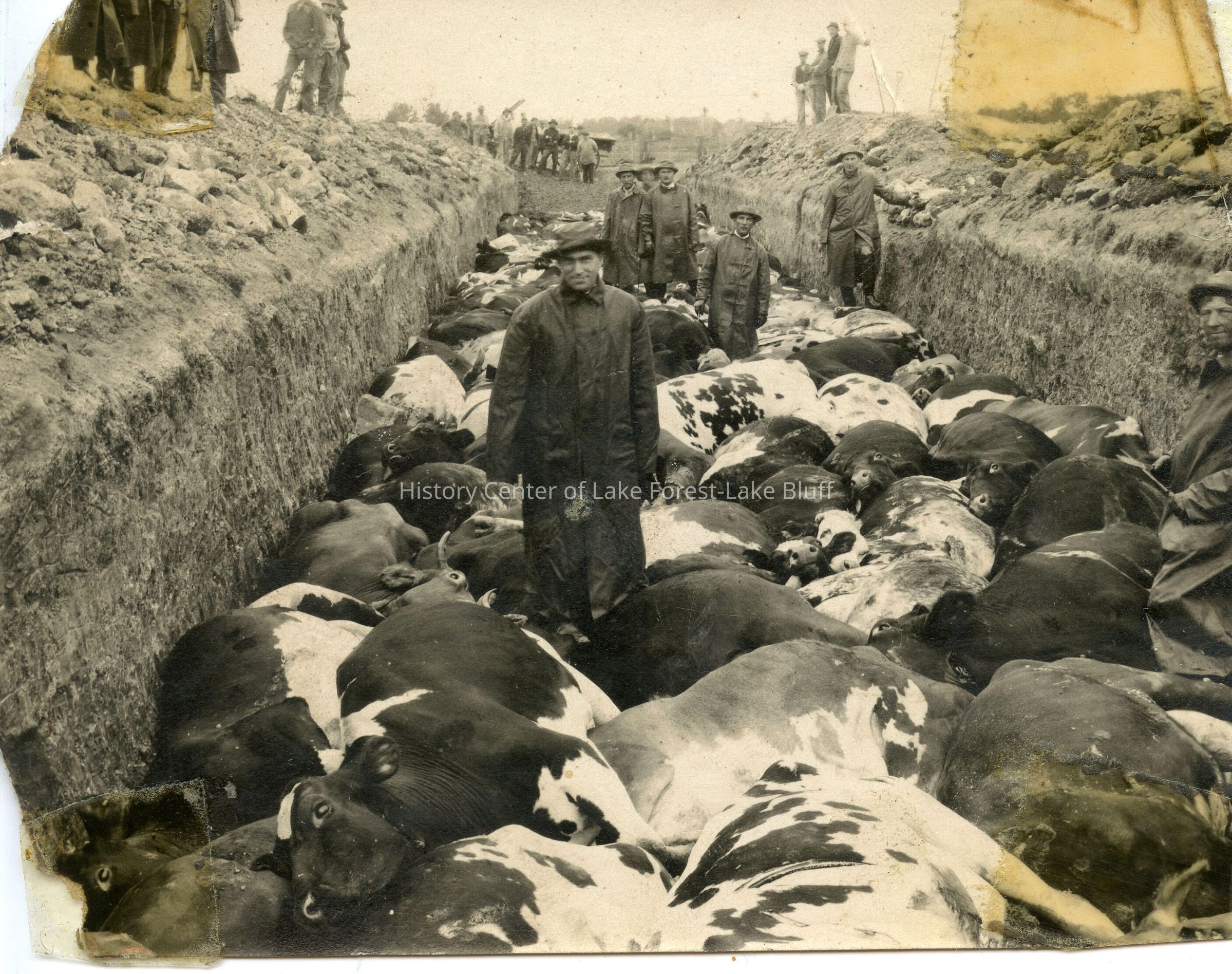 Killing and burying 100 cows with hoof and mouth disease at Arcady Farm, the Arthur Meeker estate. David W. Williams was the farm manager. Cows shot by rifles
