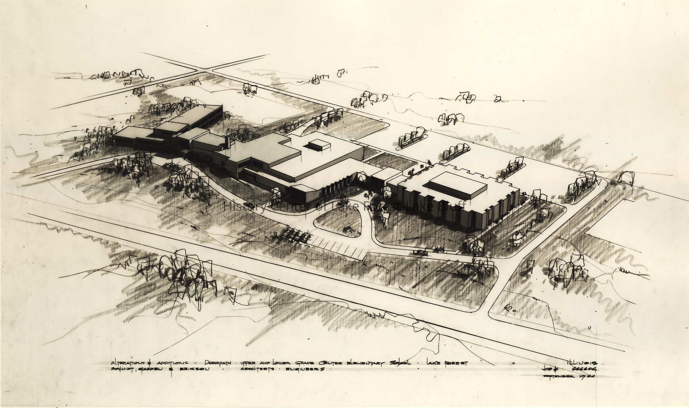 Image of rendering of Deerpath School - aerial view. Text reads: "Alterations and Additions - Deerpath Upper and Lower Grade Center Elementary School - Lake Forest - Schmidt, Garden & Erikson - Architects Engineers" Dated September 1966