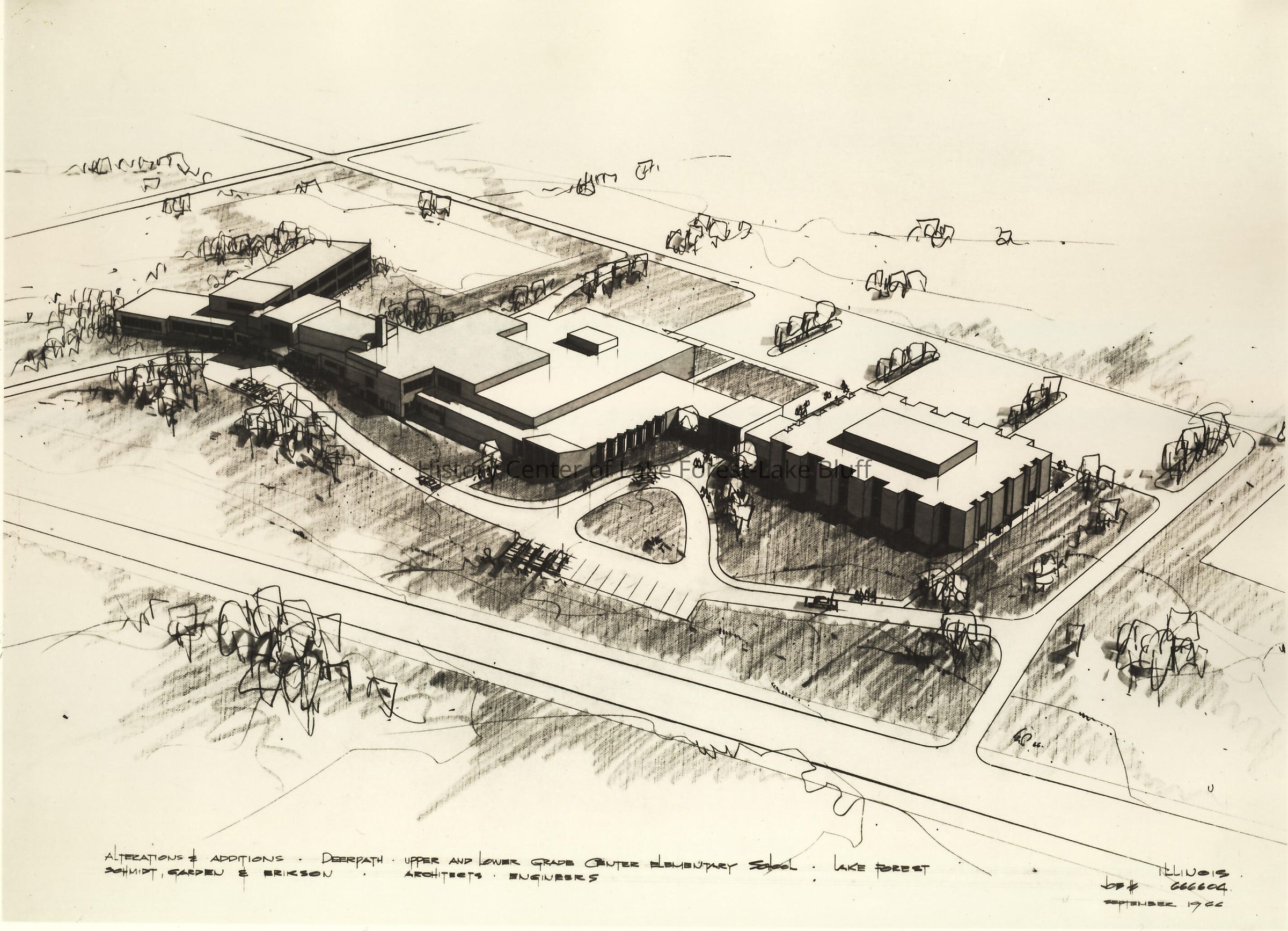 Image of rendering of Deerpath School - aerial view. Text reads: "Alterations and Additions - Deerpath Upper and Lower Grade Center Elementary School - Lake Forest - Schmidt, Garden & Erikson - Architects Engineers" Dated September 1966
