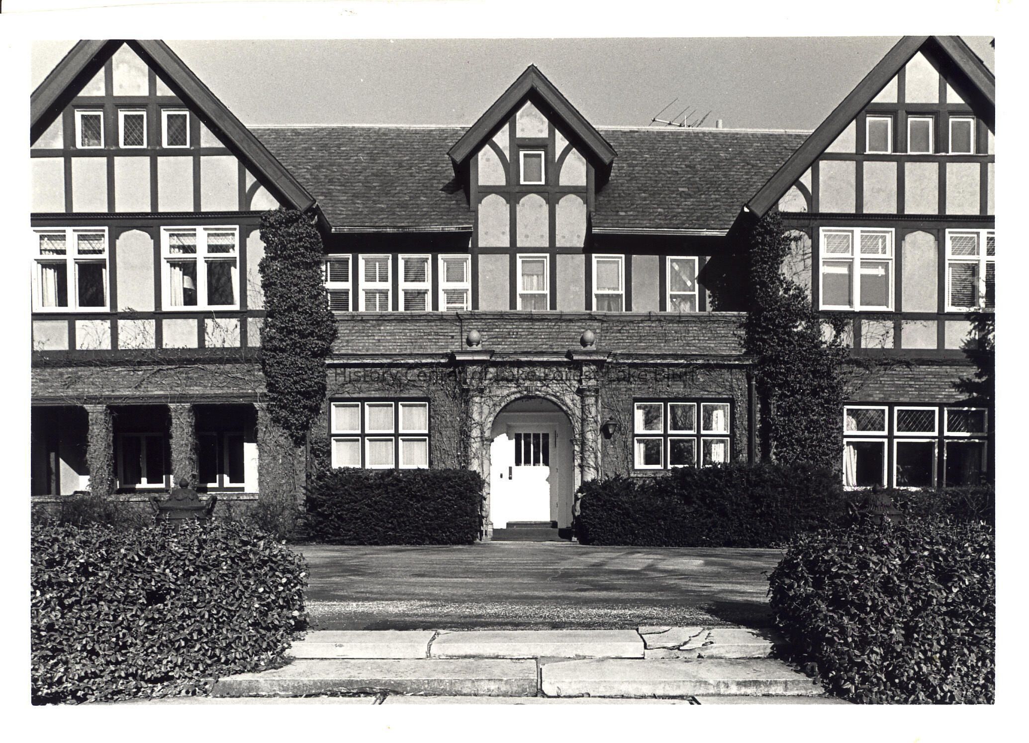Elizabethan-style brick and half-timbered structure with stone steps leading to an arched center entrance
