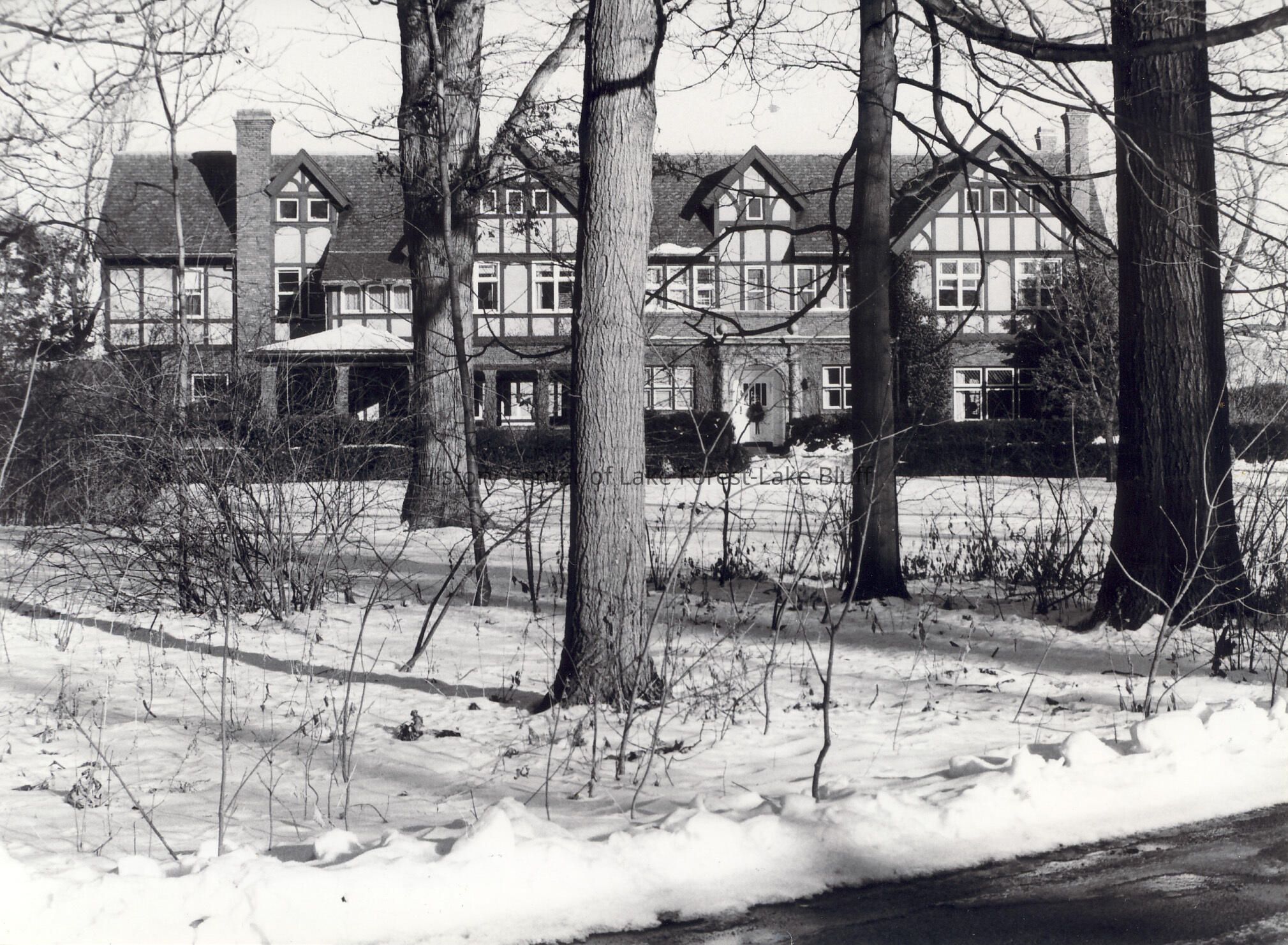 Elizabethan-style brick and half-timbered structure with two large gables flanking a center entrance, marked by a dormer, with snow and trees in foreground