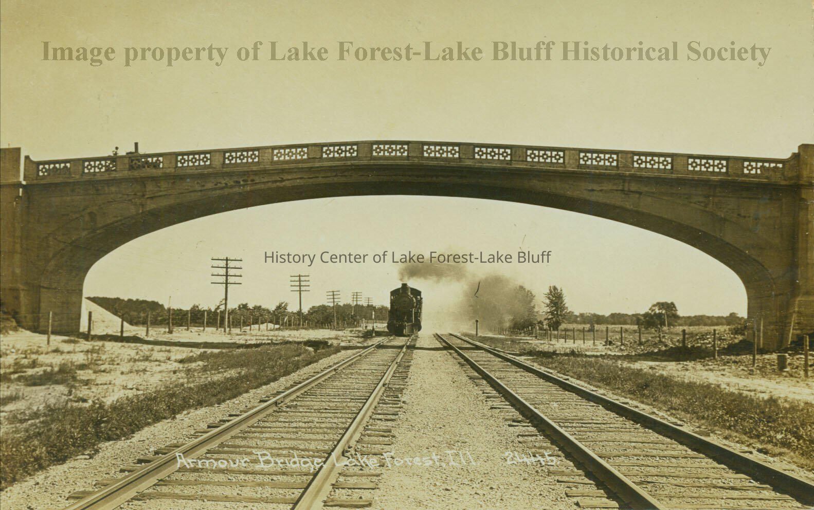 J. Ogden Armour Estate - "Mellody Farm" Armour Bridge over railroad tracks with train coming Chicago, Milwaukee, St. Paul and Pacific Railroad