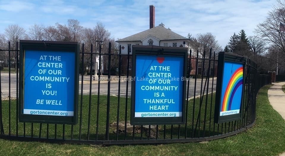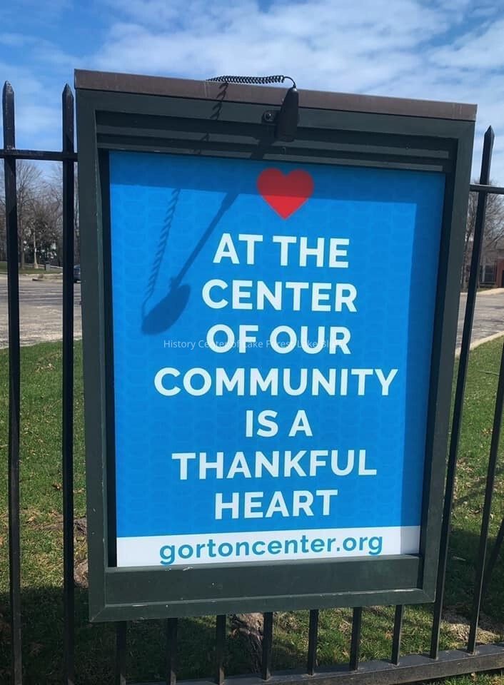Digital photograph donated by Amy Wagliardo to the History Center for "A Candid Look at Covid-19", which was designed to showcase the ways that Covid-19's quarantines affected everyday life. Shows signs in front of Gorton Community Center which were put up in support of the community.Photograph Details