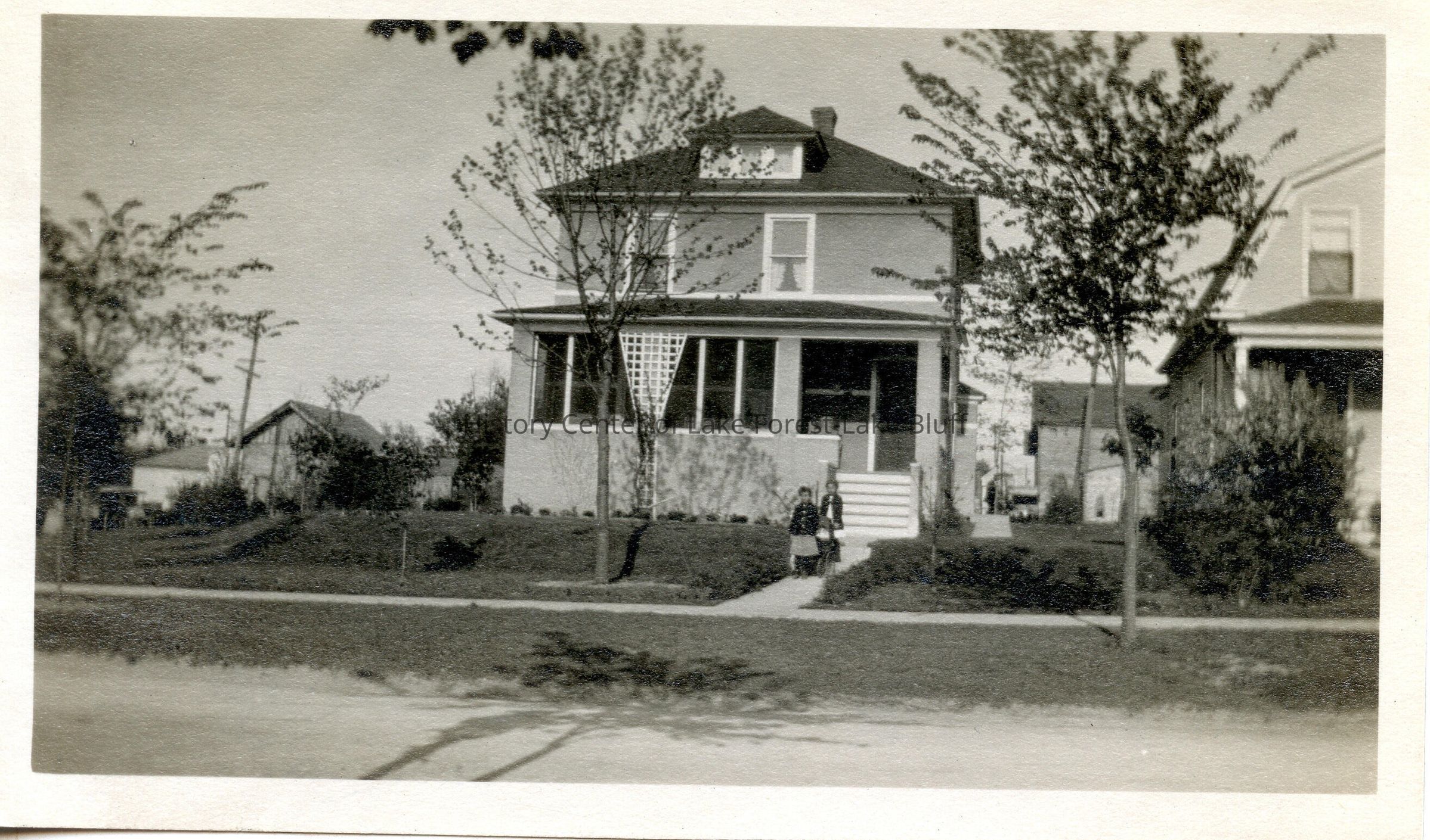 Front of two-story house. Two girls on front sidewalk. Maybe Attenridge Road. Black and white.