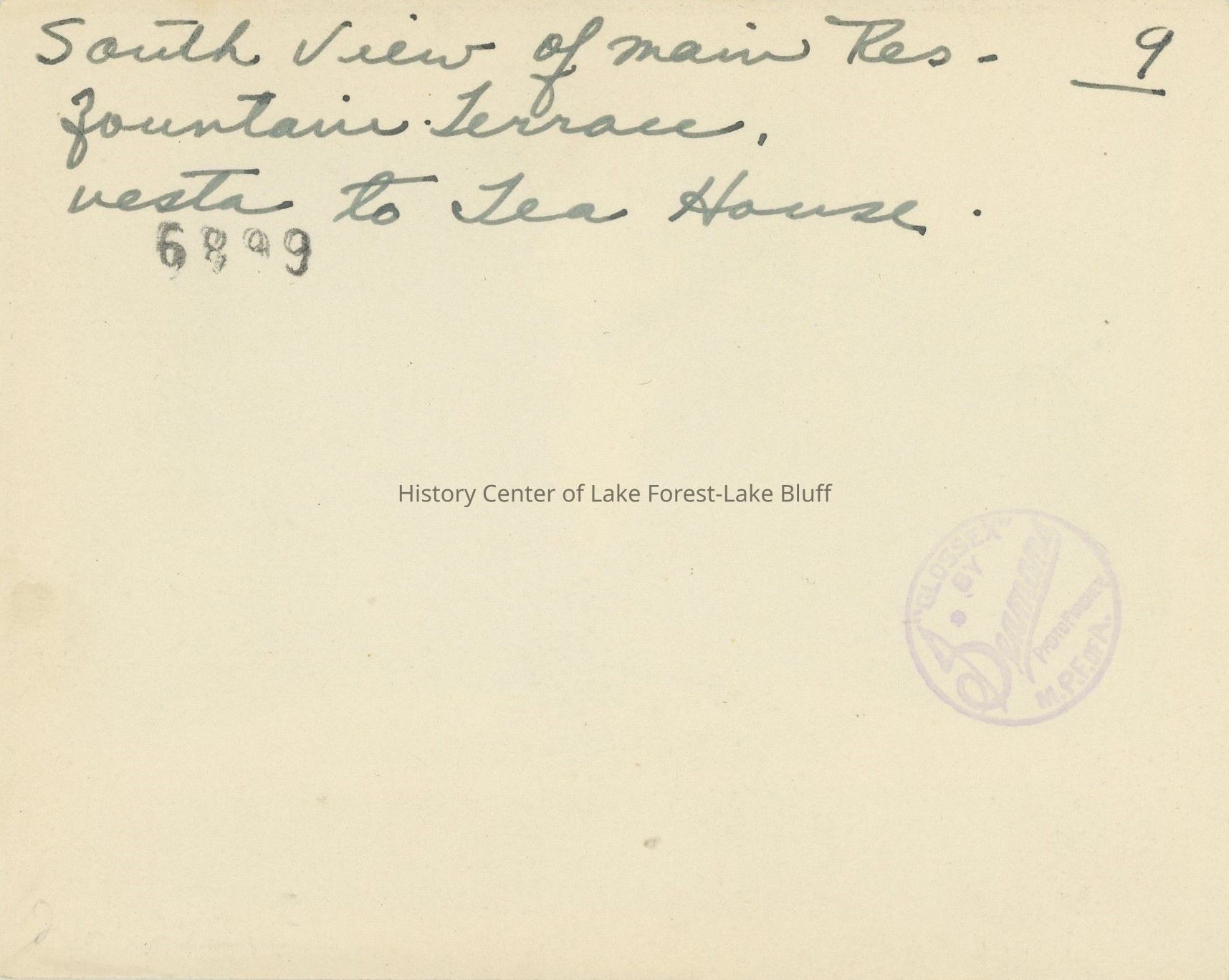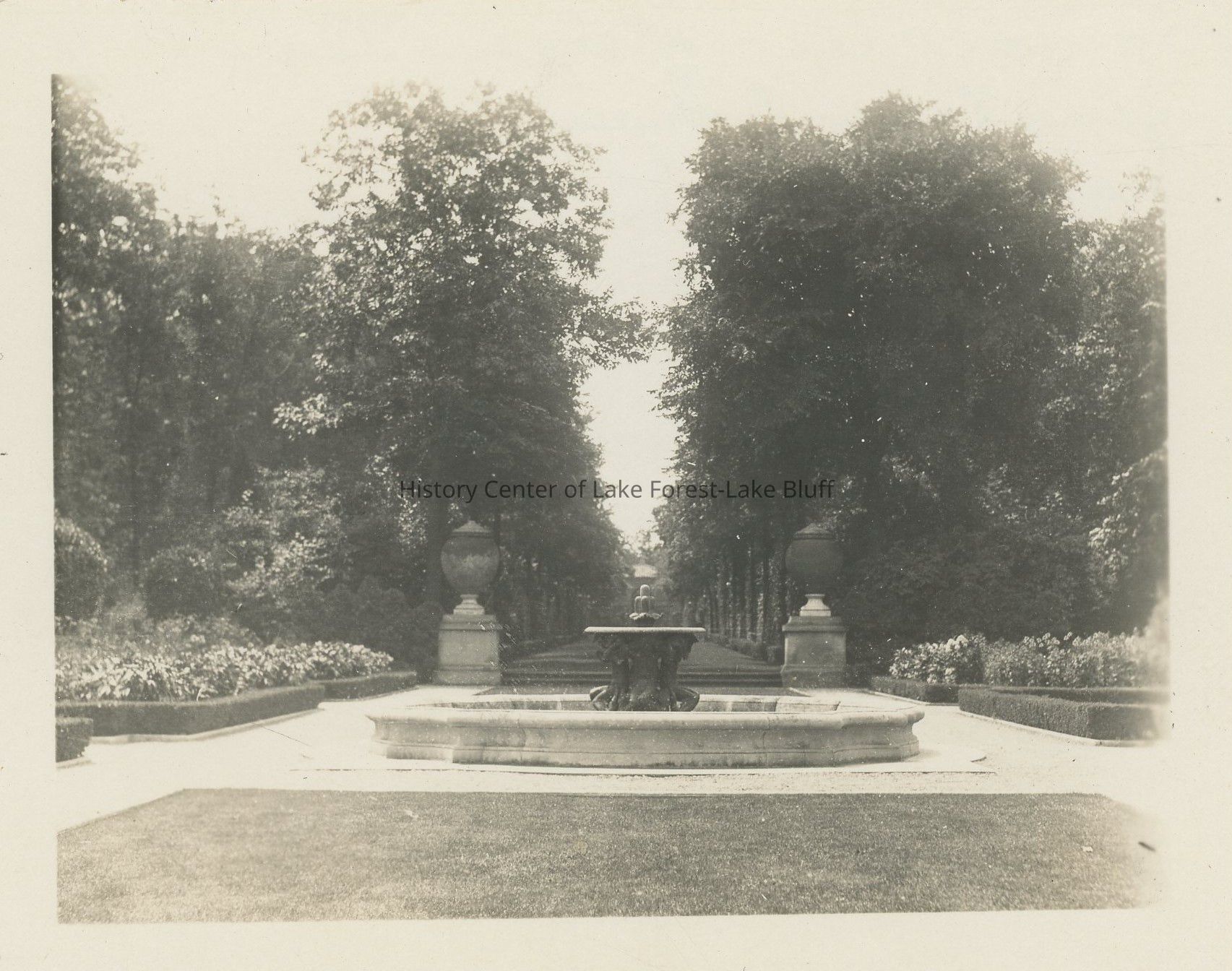 View of fountain and allee of trees at Villa Turicum, the Harold F. and Edith Rockefeller McCormick estate. "South view of main residence - fountain terrace - vista to Team House." From the collection of John "Jack" and Edythe Dunford, estate caretakers.Photograph Details
