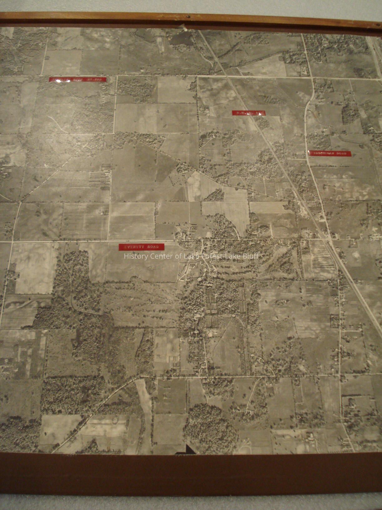 Aerial photograph showing southwest Lake Forest, dated October 23, 1954. Mounted to slats of wood - possibly used as exhibits in a meeting. Some areas are labeled in red, including Townline Road Rte. 59A, Chicago, Milwaukee and St. Paul Railroad, Waukegan Road, and Everett Road.Lexicon