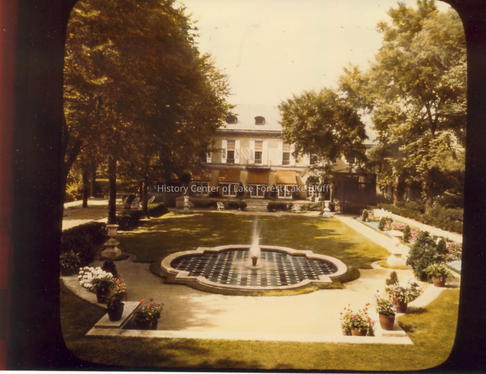 center fountain and pool surrounded by potted flowers and shrubs with view of rear facade of residence