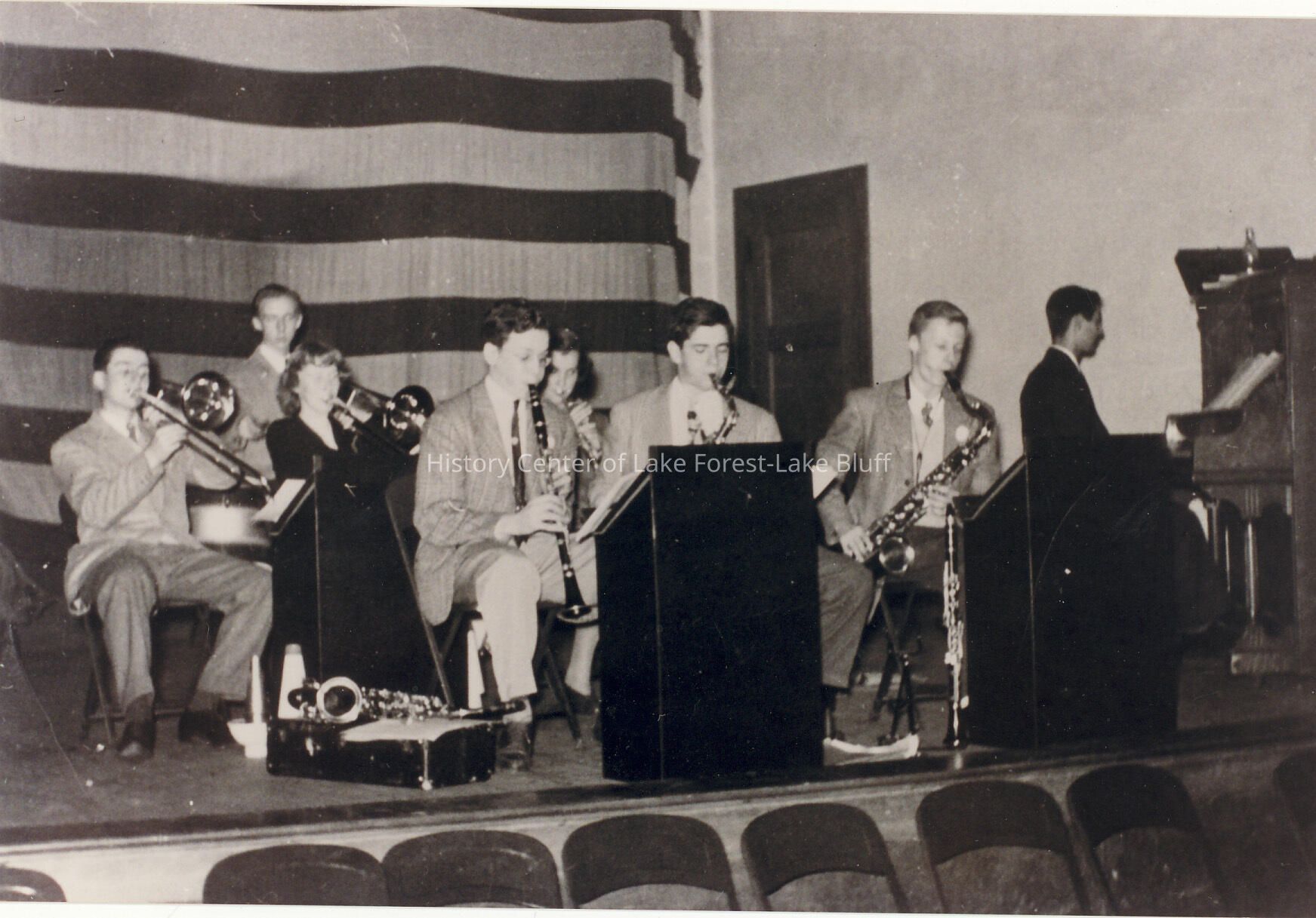 Black and white image of 8 teens playing band instruments on a stage in front of an American Flag with big band style music stands. Piano player is at right.