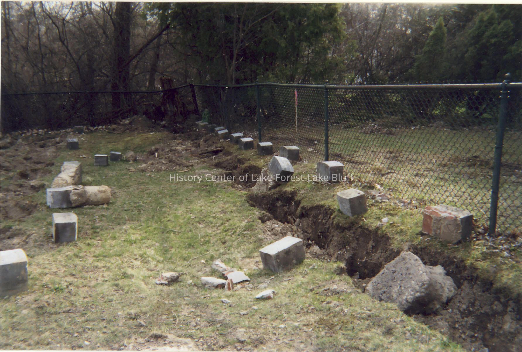 View of uprooted headstones along green fence.