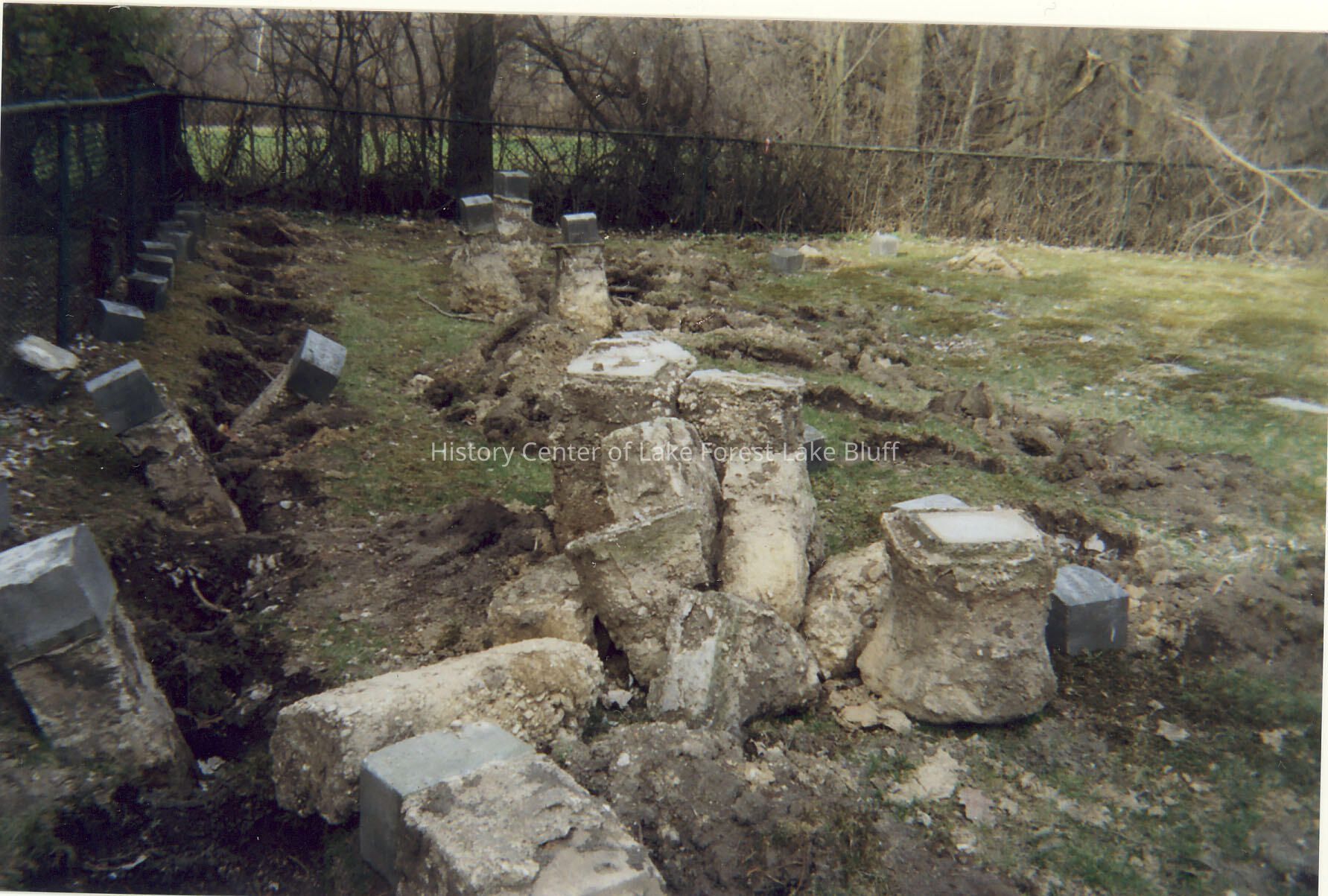 Additional angle of uprooted rows of headstones.