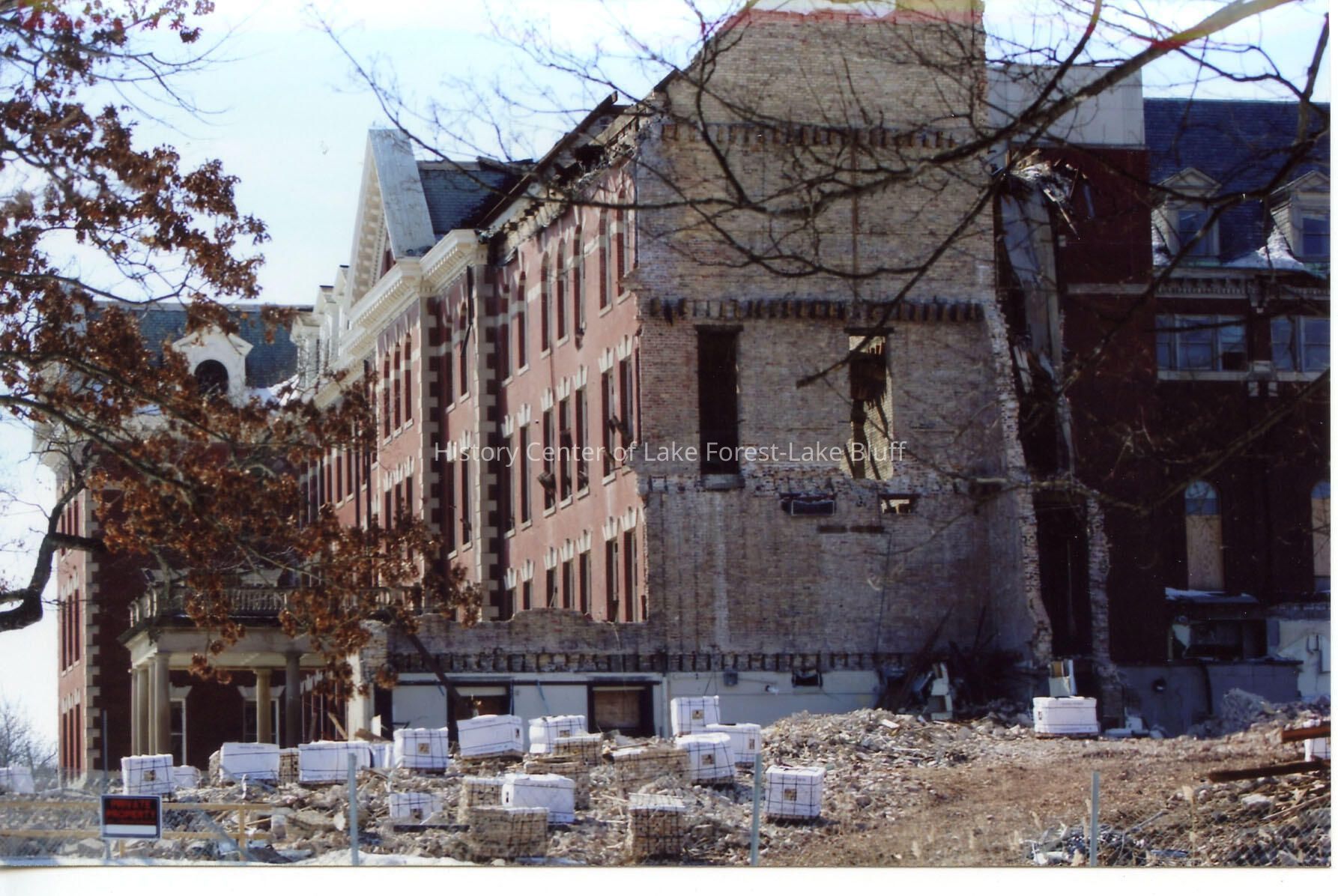Barat College, during 2013-2014 demolition process of Old Main. Photo shows north side of Old Main. Taken March 9, 2014.