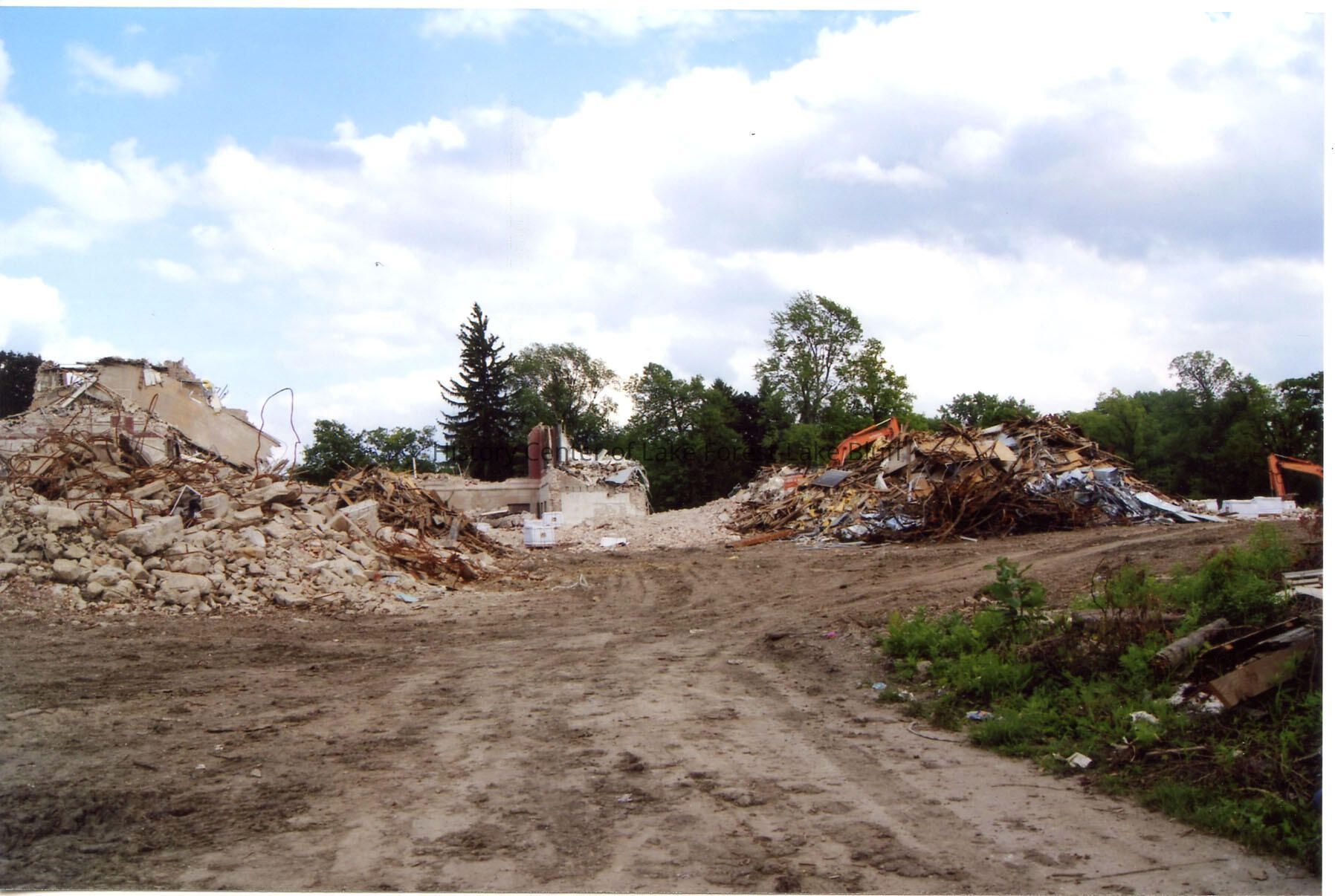 Barat College, during 2013-2014 demolition process of Old Main. Photo shows west side of Old Main, now a pile of rubble. Taken July 6, 2014.
