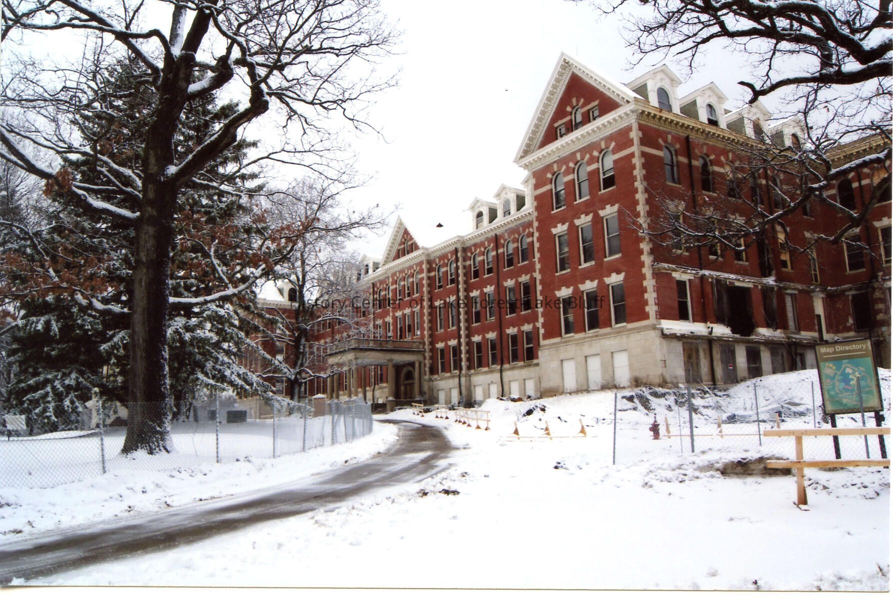 Barat College, during 2013-2014 demolition process of Old Main. Photo shows Old Main, with fences around it. Taken December 22, 2013.