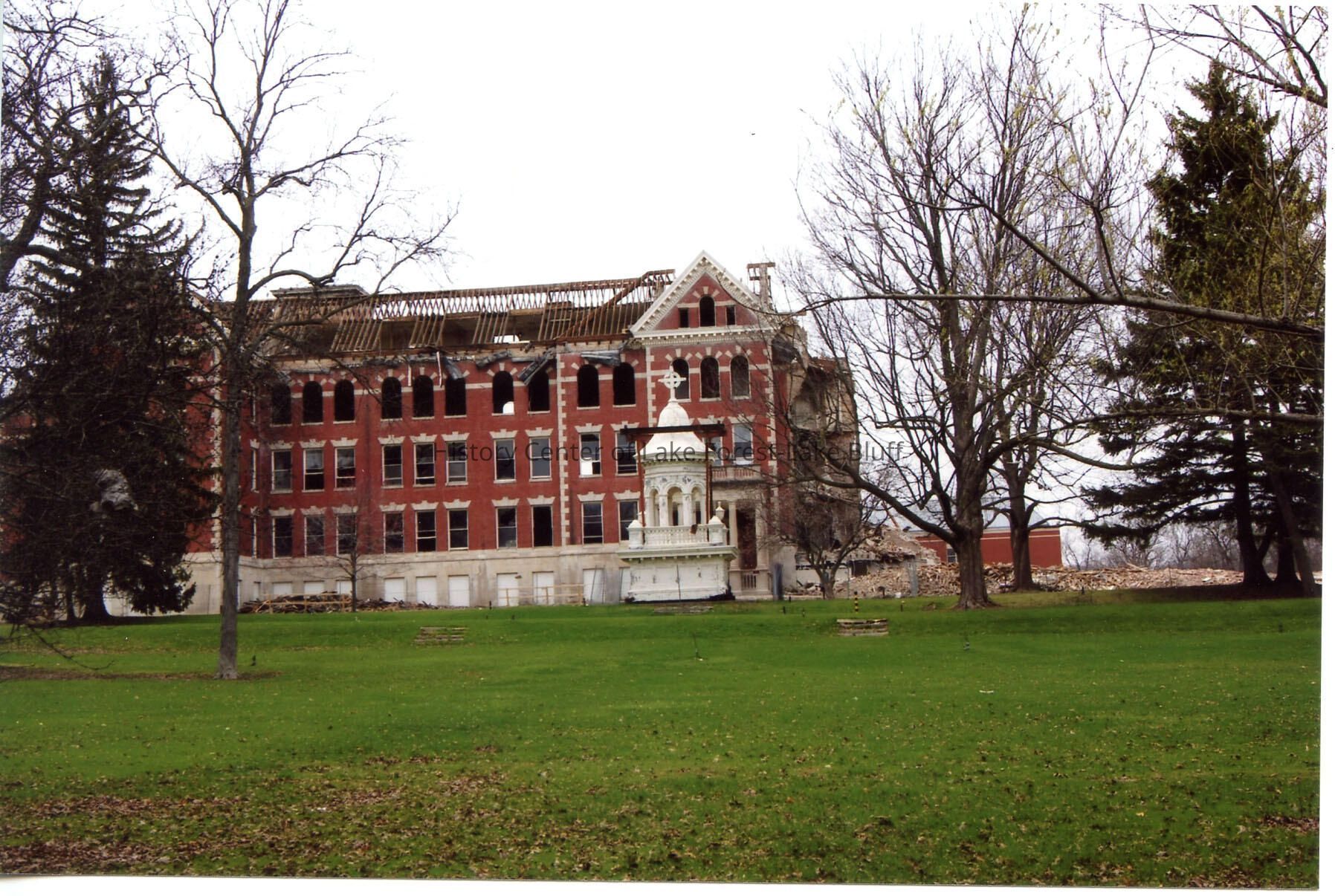 Barat College, during 2013-2014 demolition process of Old Main. Photo shows Old Main, with cupola removed. Taken April 27, 2014.