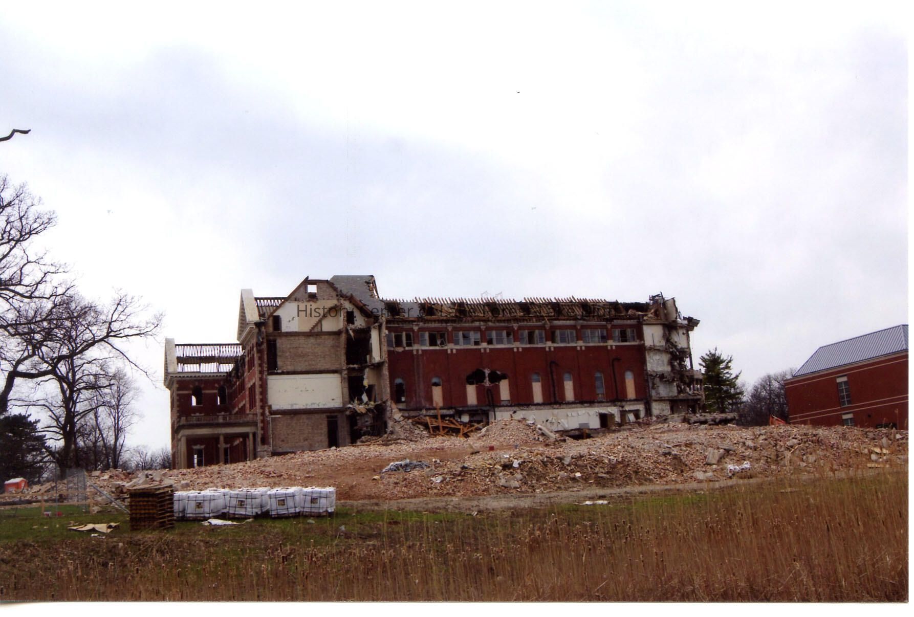 Barat College, during 2013-2014 demolition process of Old Main. Photo shows north side of Barat of Old Main. Former Cooney Library building is visible at right. Taken April 27, 2014.