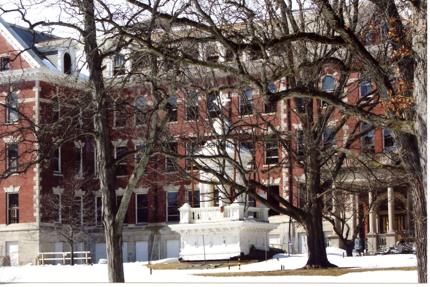 Barat College, during 2013-2014 demolition process of Old Main. Photo shows Old Main with cupola removed. Taken December 22, 2013.