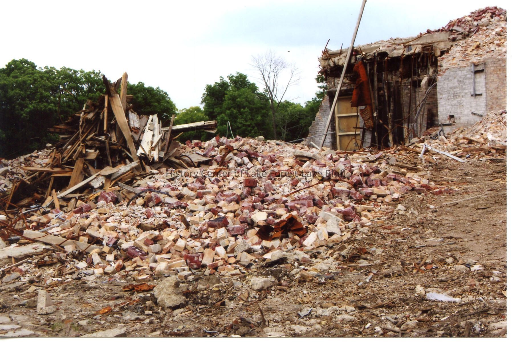 Barat College, during 2013-2014 demolition process of Old Main. Photo shows west side of Old Main, now a pile of rubble. Taken July 6, 2014.