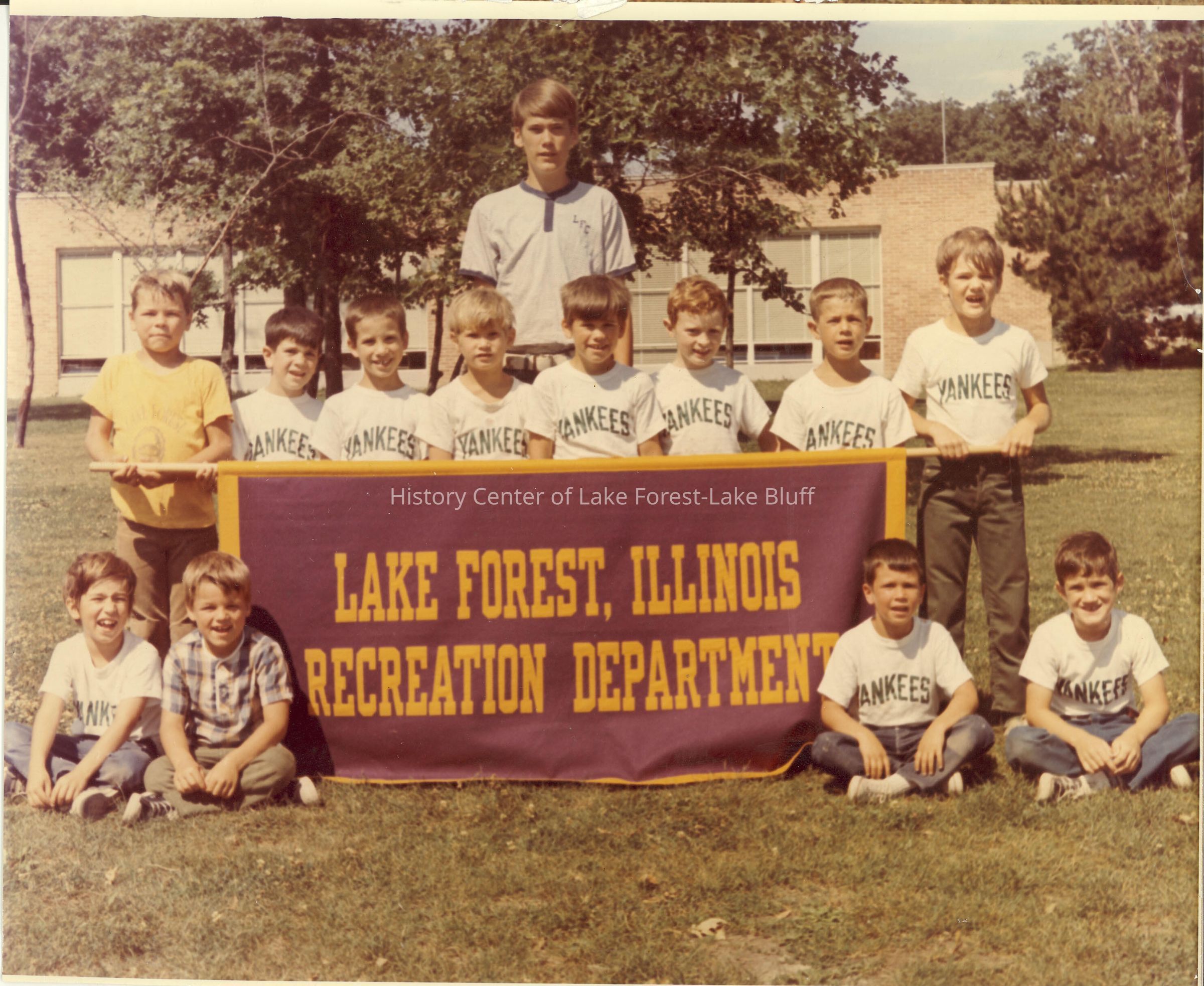 Baseball team photo- twelve players and one coach; team is holding the LF Rec Dept banner; They are wearing white shirts and thier team name is Yankees.Names listed on the back are: Jim Glenn, Matt Glenn- 2nd from left; Jon Hofer (3rd from left) Lance Crook - redhead, Mike Capozzi -2nd from right, Dan Abby, Ken Robson, Rich Bagatti - 2nd from rightLexicon