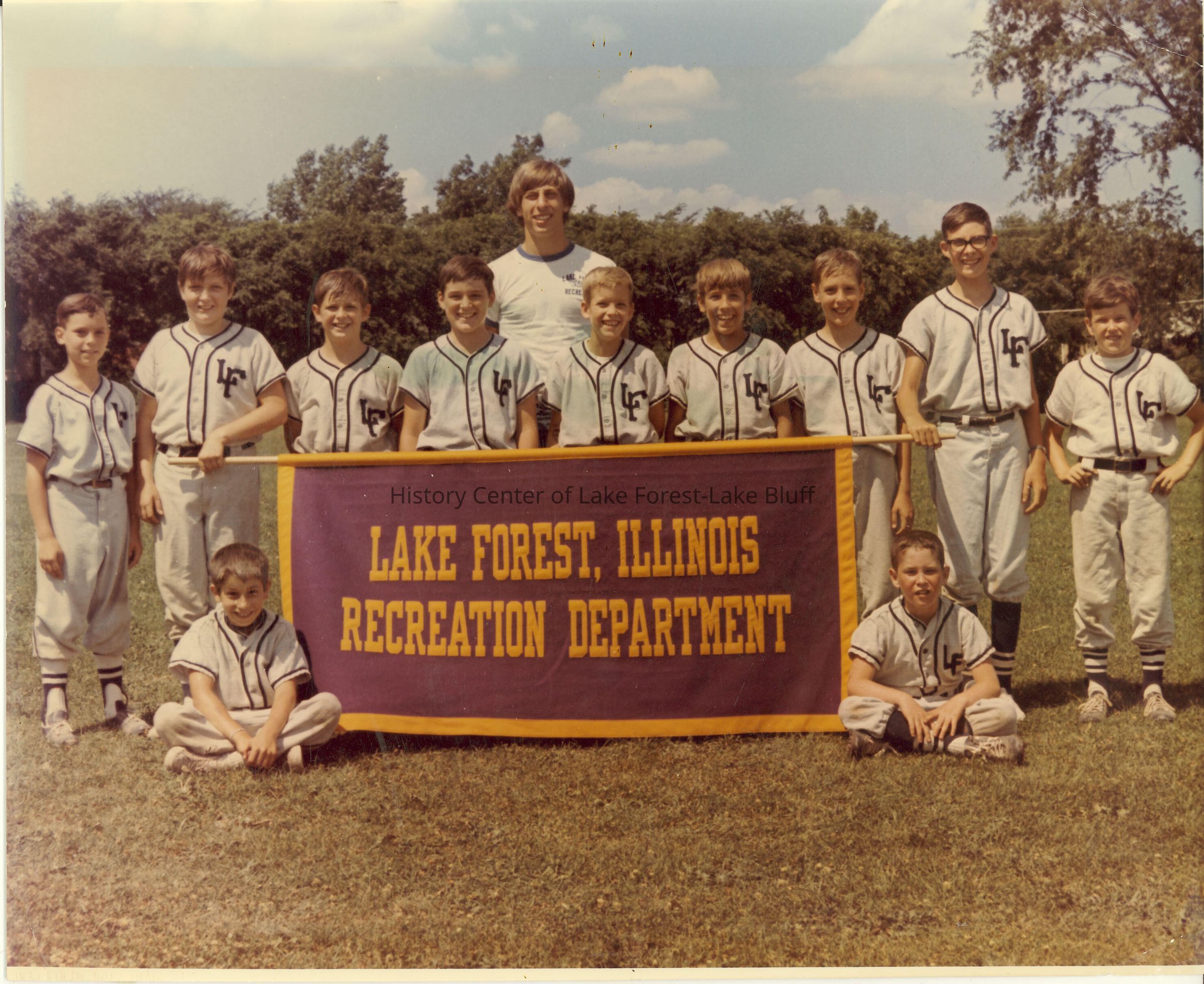 Softball team photo- Eleven players and one coach; players are holding the LF Rec Dept banner; the uniforms are white with dark blue or black trim. One of the players is wearing glasses