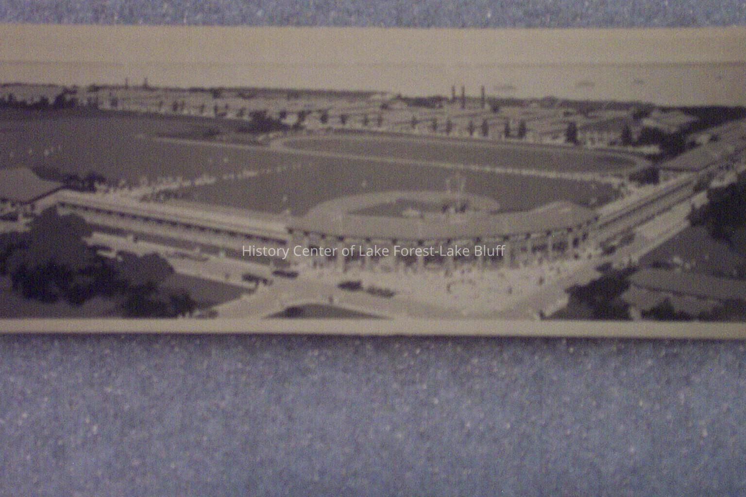 Photograph copy of a rendering by Weisner of baseball stadium with athletic field and barracks behind.