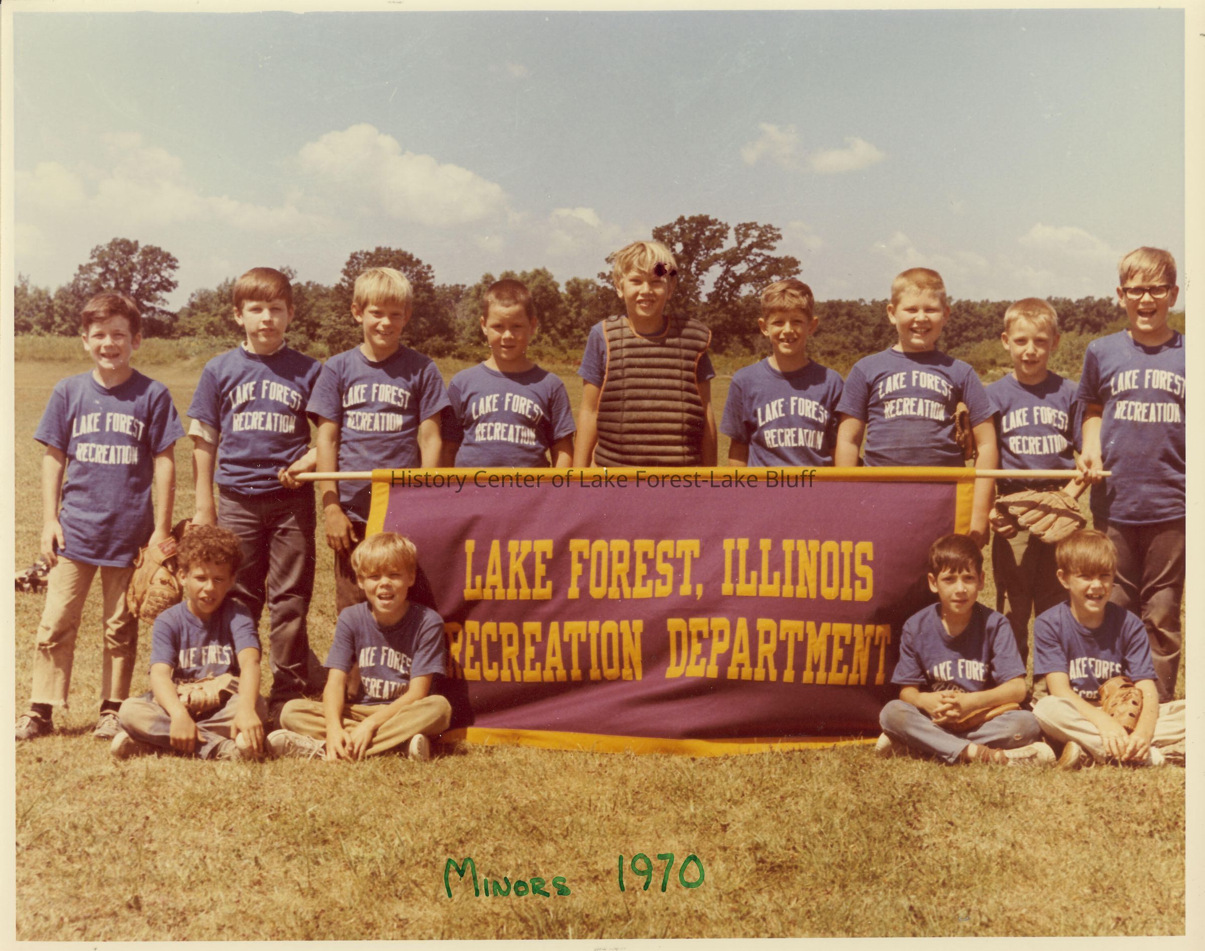 Team photo of the "Minors" 1970. Thirteen players holding the Lake Forest Recreation Department banner. They are wearing blue t-shirts.