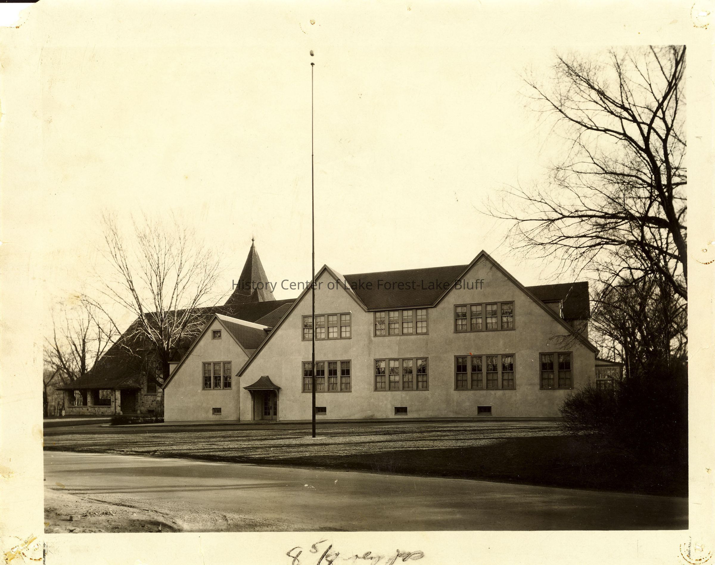 Bell School at 740 North Sheridan Road, with flagpole in center. This photograph was used in the Lake Forester, 1945. Bell School was demolished June, 1969.