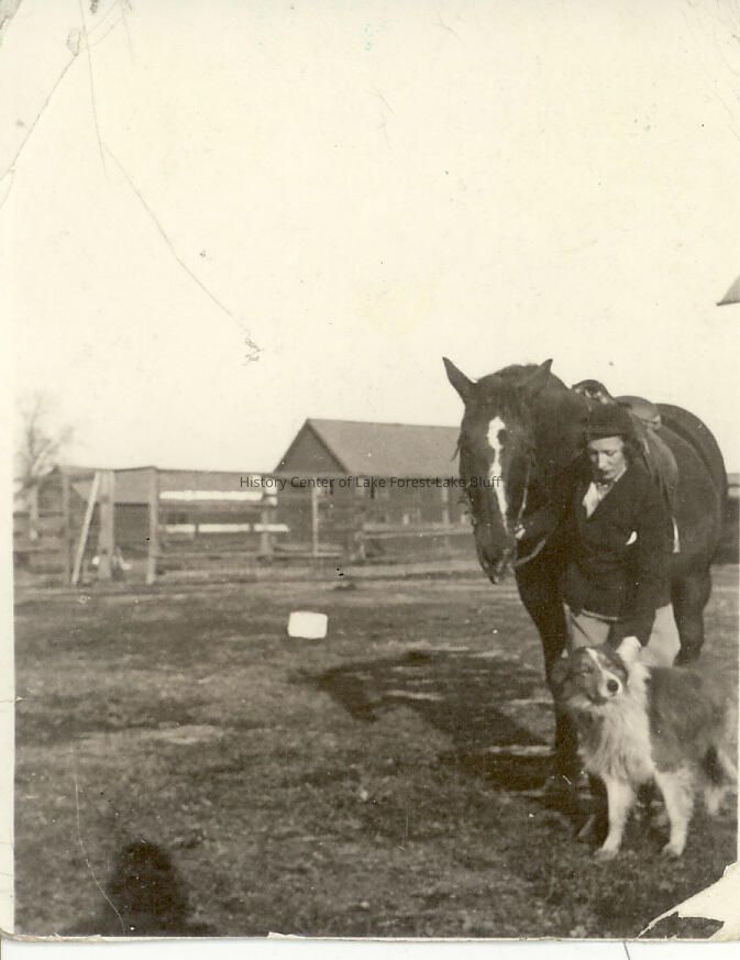 Black and white photograph of Bessie Sneddon Bayes with dog and horse, Tillie and Laddie, on the farm in Everett Westleigh or Lancaster Farm
