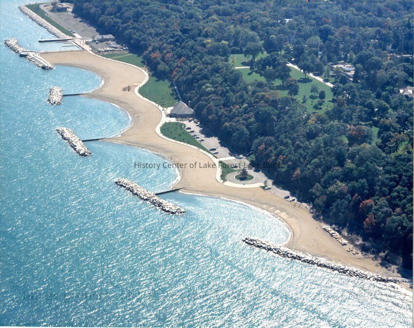Color aerial photo of Forest Park Beach, following shoreline restoration work done in the 1980s. Dated September 1987.
