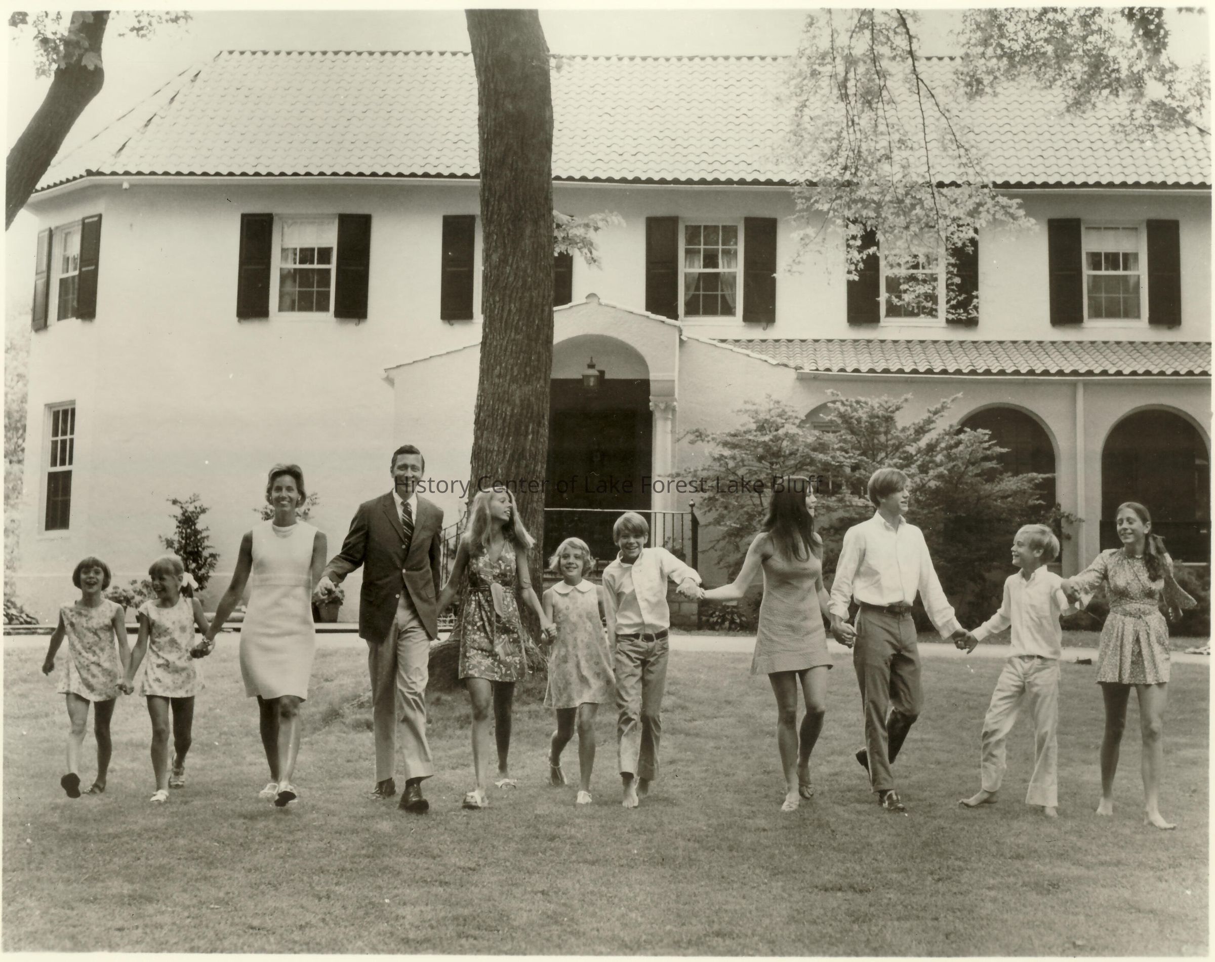 Bill and Martha Rentschler and their children on the lawn of their Lake County (IL) home. Left to right the children are: Martha, Hilary, Mary, Elizabeth, Tad, Sarah, Peter, Doug, and Phoebe.Lexicon