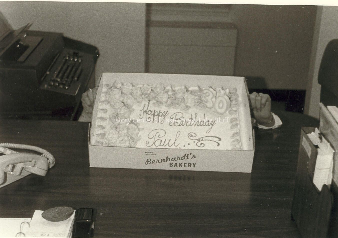 Birthday cake from Bernhardt's Bakery. Cake says, Happy birthday, Paul".Photographs relating to Lake Forest Hospital collected for the 100th Anniversary of the Hospital by the Development Department.