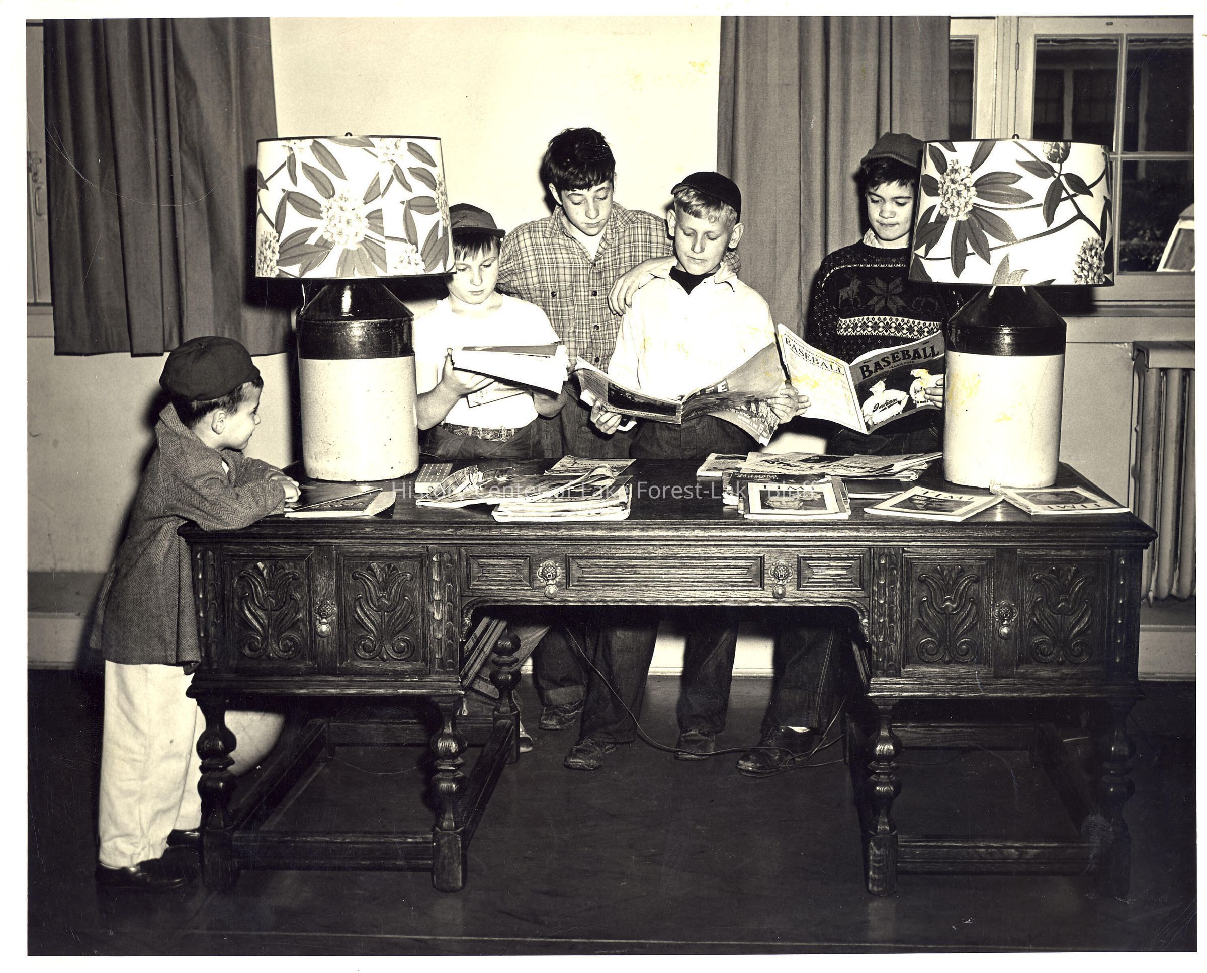 YMCA club children, 5 boys standing around a wooden desk leafing through magazines